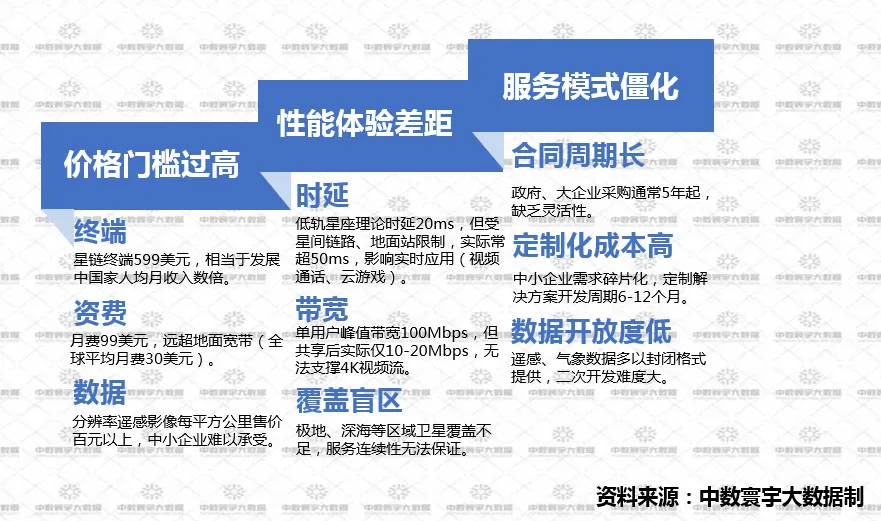 当前在三大核心痛点:一是价格过高,终端、资费及遥感数据让普通用户与中小企业难以承受。二是实际时延、带宽不及预期,极地、深海等存在覆盖盲区。三是服务模式僵化,合同周期长、定制成本高、数据开放度低。