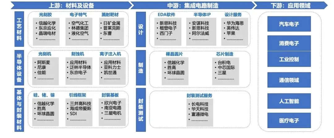 集成电路产业链上游主要包括工艺材料、半导体设备、基体与封装材料三个主要环节,是产业利润最高的环节,根据具体产品不同毛利率达30%-70%不等。中游由芯片设计、制造、封装测试等步骤构成,是集成电路生产的核心流程,代表企业包括华为海思、英伟达、台积电、中芯国际、三星等。其中,封装测试环节附加值相对较低,毛利率仅12%-15%。集成电路产业链下游主要是多元应用场景,汽车电子、消费电子、工业控制等领域需求正快速拉动着整个产业链的技术迭代与产能扩张。