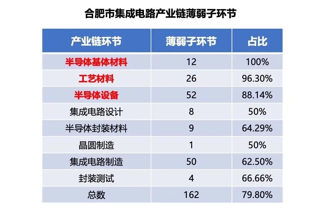 目前,合肥全产业链近四成环节属于薄弱环节,企业数量少于10。其中,半导体基体材料、工艺材料、半导体设备这三大领域的薄弱子环节占比均超过85%,是最明显的短板。
