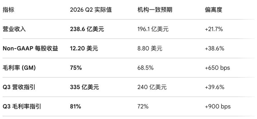 营收:238.6 亿美元(同比增长约 190%),大幅超出市场预期的 196 亿。