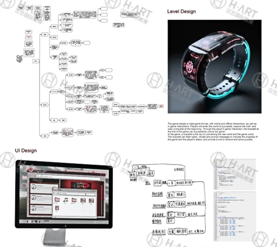 汉艺的M同学、L同学、Z同学的游戏项目《404》就体现了这种能力,他们为游戏设计了一款手环,可以随时收集用户的心跳与所处环境的光线,再让AI根据这些数据生成不同的剧情。