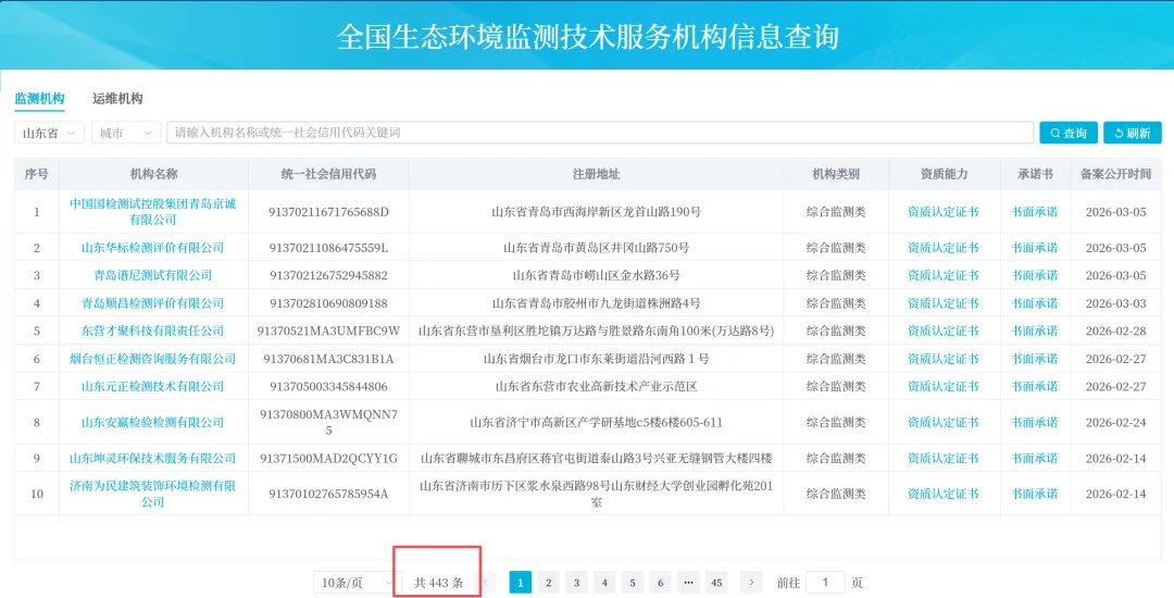 截至2026年2月,山东省以443家备案机构的规模,稳居全国生态环境监测技术服务机构首位。这一数字背后,是民营监测力量的全面崛起,以及规模化、全区域、高适配的发展格局正式形成。