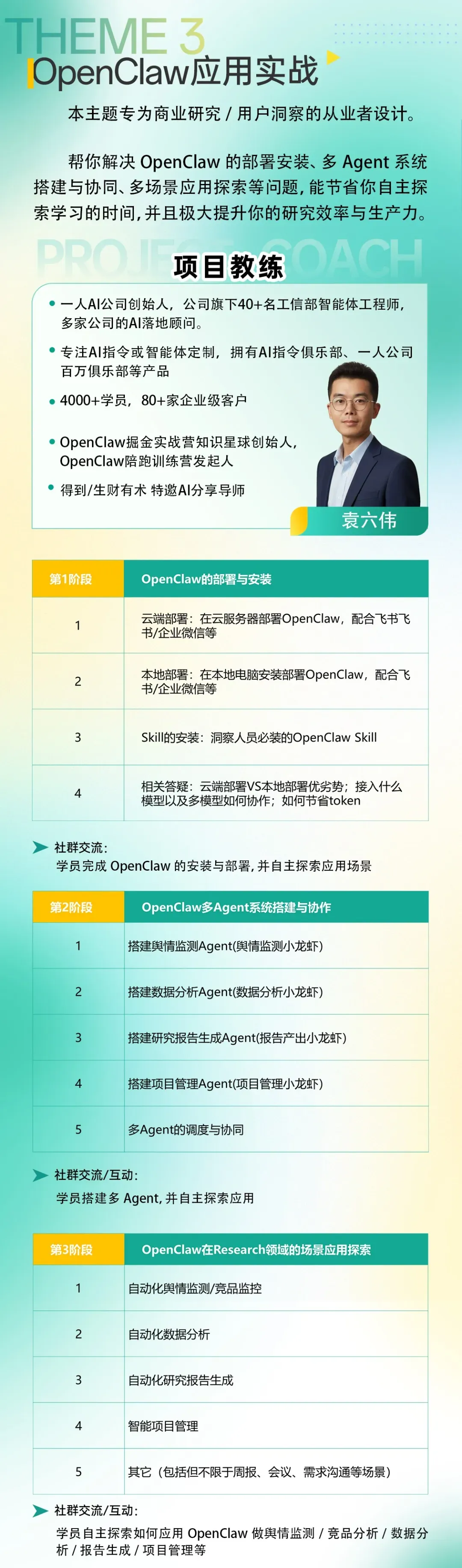 为此特推出线上训练营项目带练服务。第3期主题《OpenClaw应用实战》,专为洞察人员定制,3月21日周六晚即将开营,星球会员仅需99元/人,欢迎找助理报名(VX):Peron001。