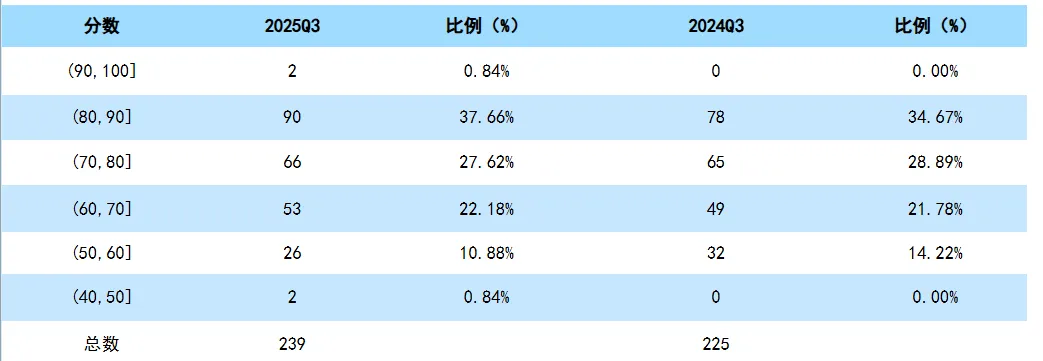 截至202509,在有历史同期数据可比对的 225家公司中,76家综合财务实力等级上升,88家综合财务实力持平,61家综合财务实力下降。