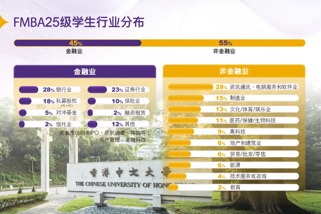 根据2025级新生背景统计,FMBA课堂呈现出新的结构特征:非金融行业的学生比例为55%,首次超过金融行业背景的学生(45%)。这一变化也反映出FMBA生源结构正呈现出更多元的发展趋势。