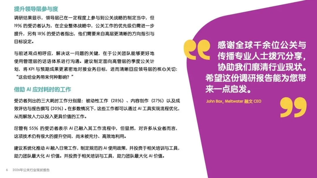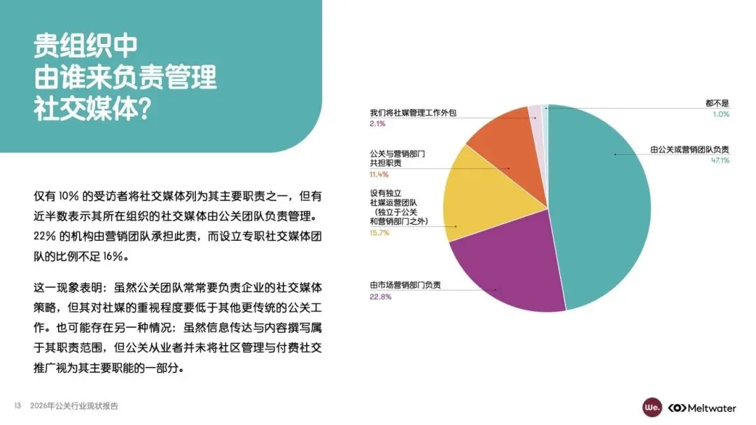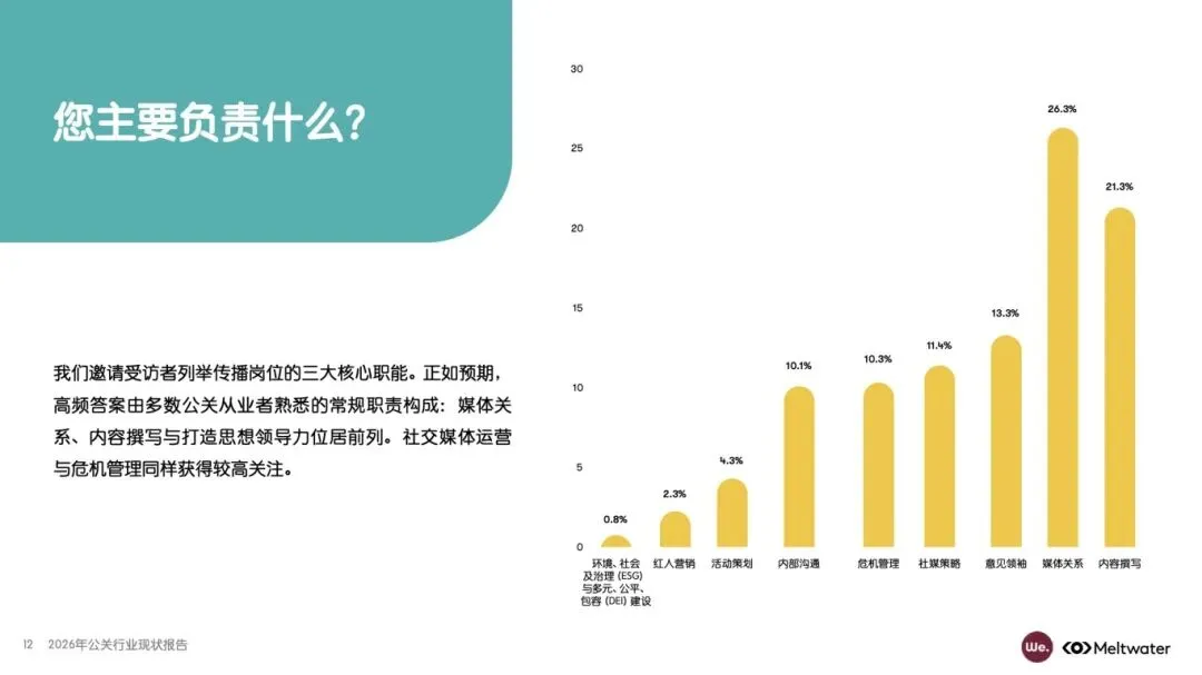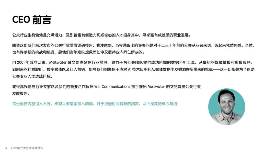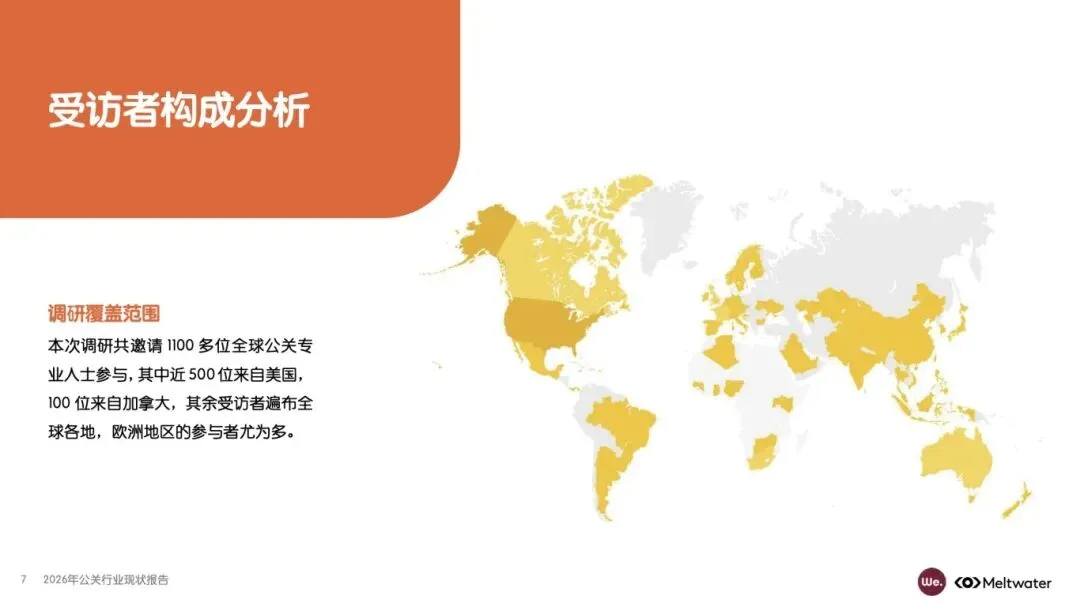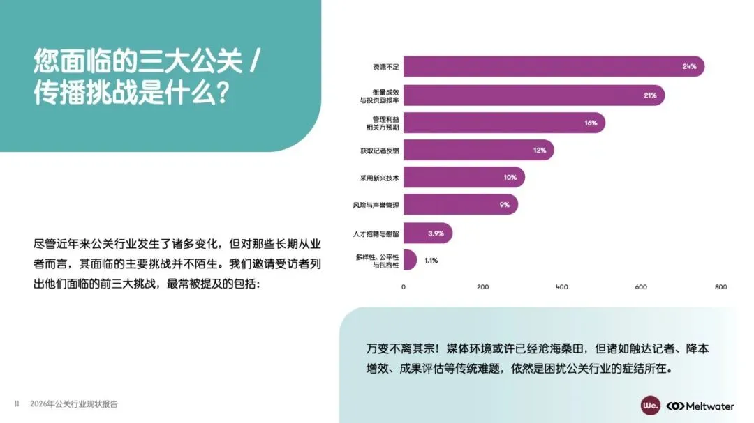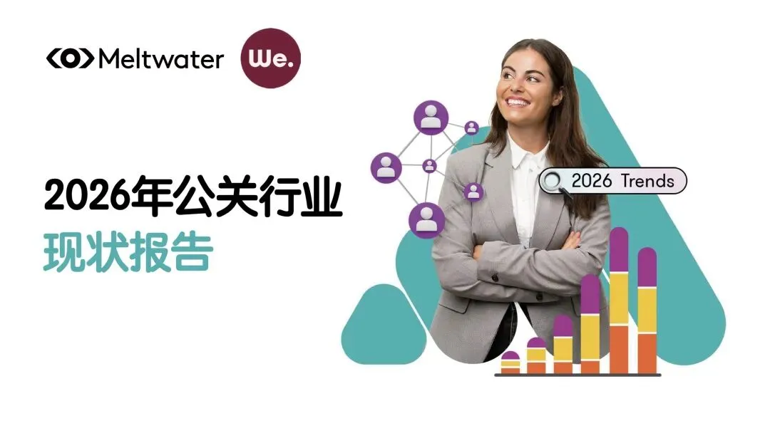该报告由 Meltwater 融文与 We. Communications 联合发布,基于全球 1100 多位公关专业人士调研,覆盖企业类型、职位层级、团队规模等多维度受访者构成,分析 2026 年公关行业职责挑战、AI 应用影响、媒体关系管理、成效评估等核心议题,揭示行业在技术变革、资源约束下的发展现状与未来趋势,为从业者提供战略参考。