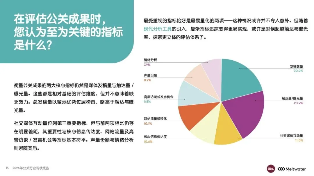 :主题相关性(32.1%)、时效性(24.2%)、记者关系维护(22%)是获得媒体报道的核心要素。一对一电子邮件是最有效的新闻推送渠道(45.9%),领英(LinkedIn)成为公关从业者最重视的社交平台(62.4%)。媒体数据库与个人人脉是寻找记者的主要途径,体现行业 “以人为本” 的本质。 - 成效评估仍依赖基础指标,深度不足