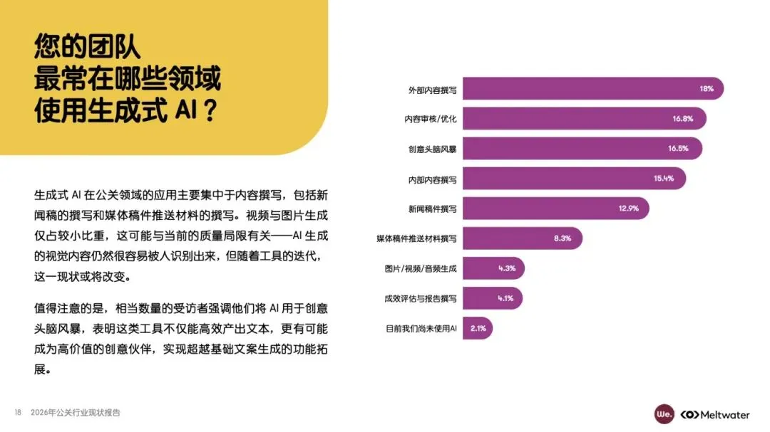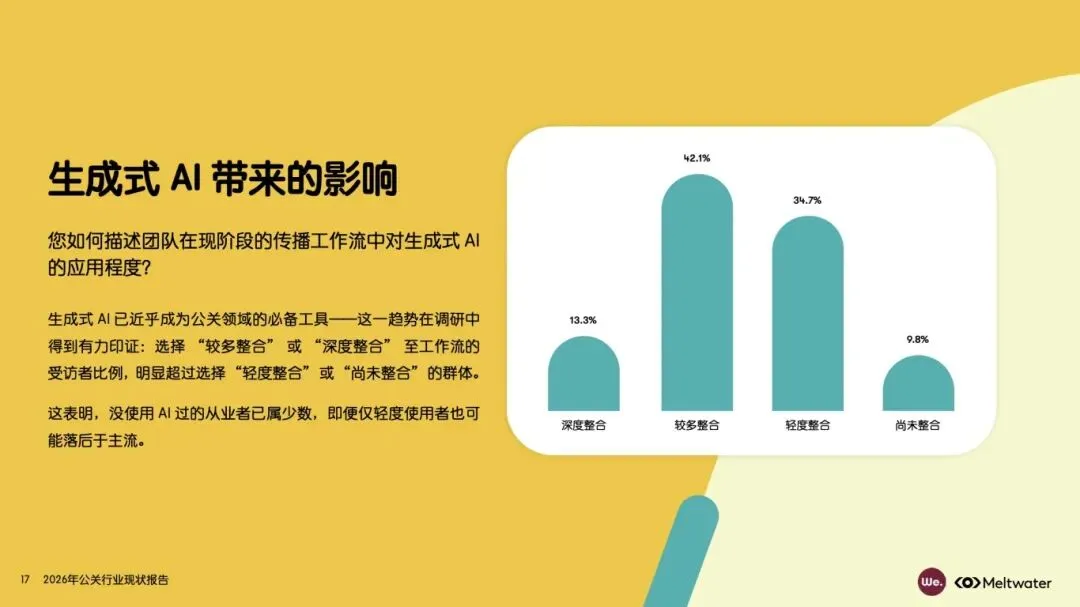 :24% 受访者认为资源不足是首要挑战,但 69% 预计 2026 年预算不增加,预算决策权多由 CEO 或 CMO 掌握,公关负责人话语权有限。解决路径需优化评估指标,将公关成效与网站转化率、声量份额等业务 KPI 挂钩,以争取资源支持,同时提升领导层对公关工作的认知与参与度。 - 生成式 AI 成为行业核心变革力量