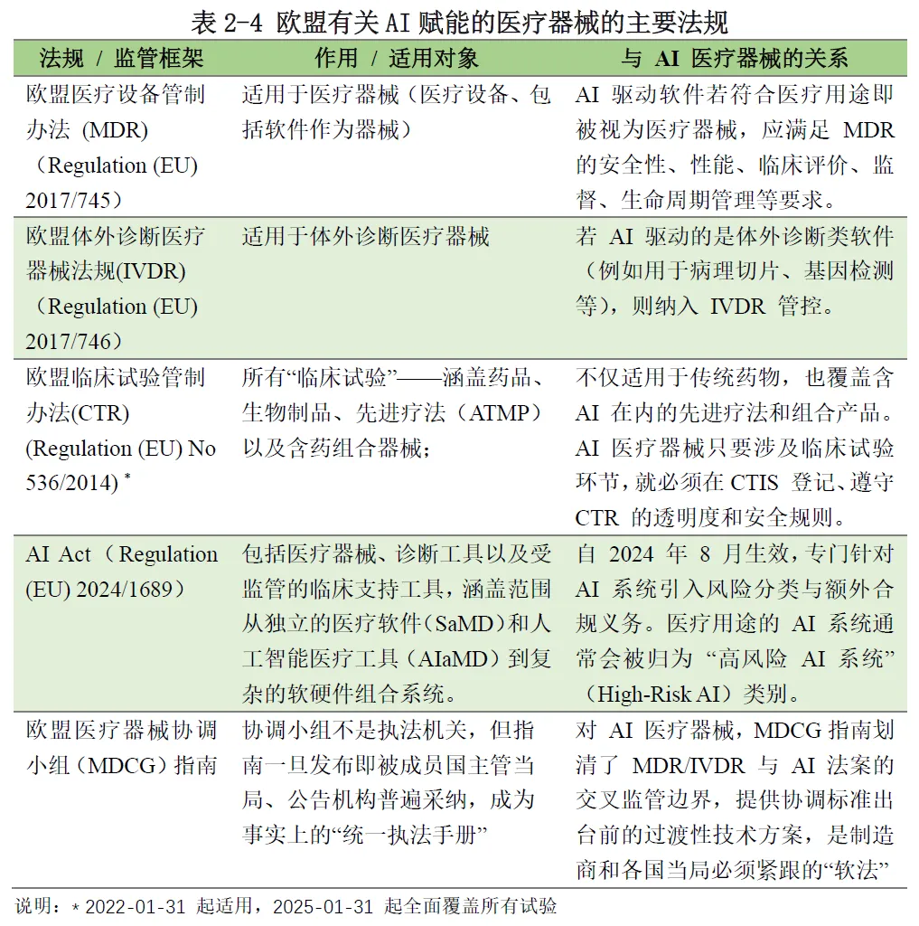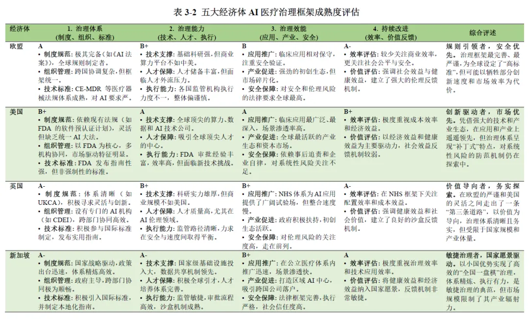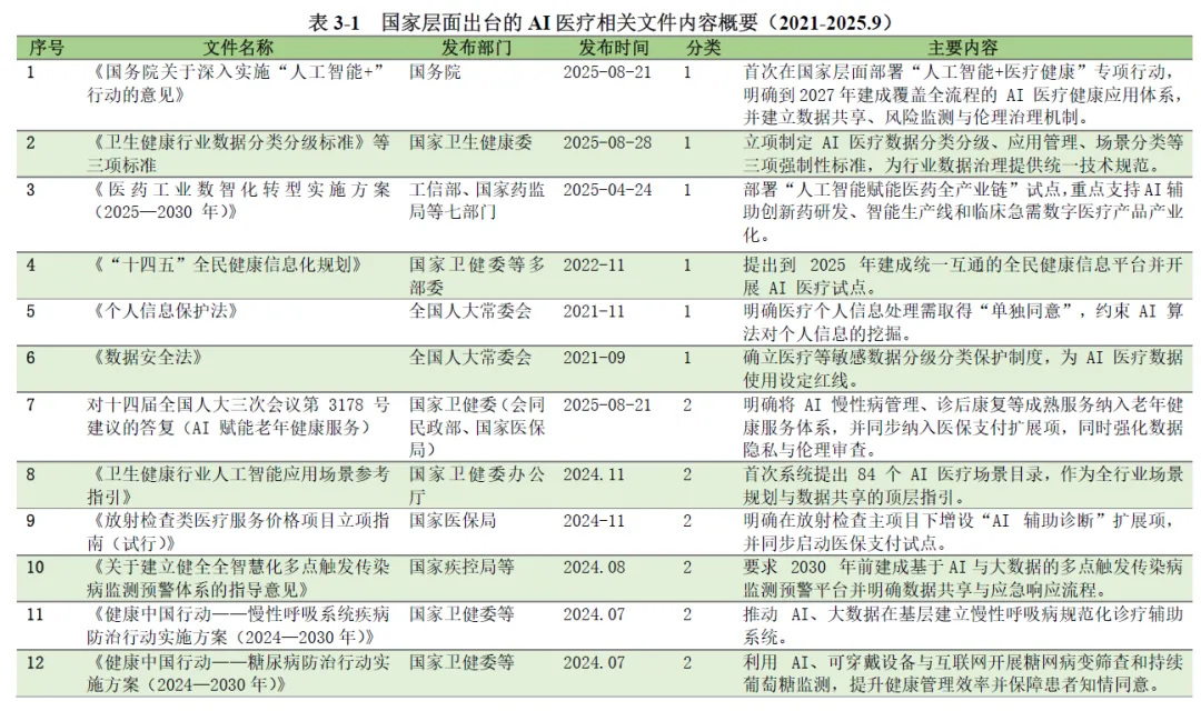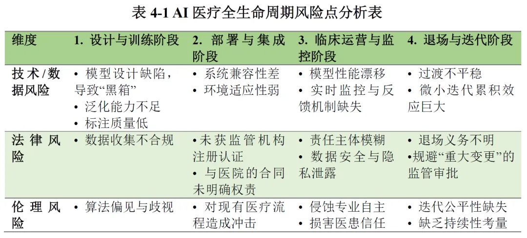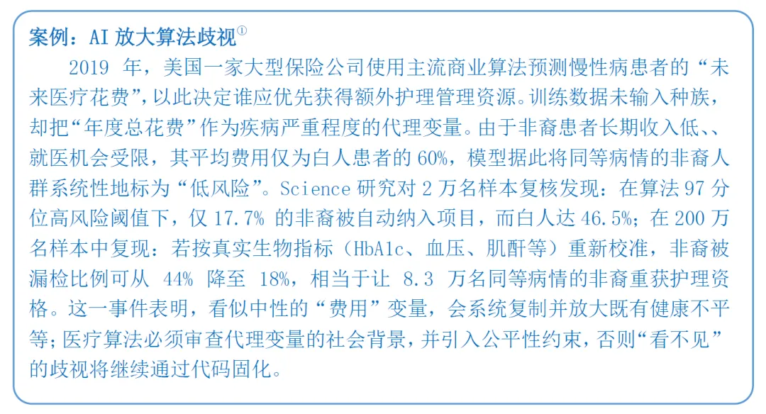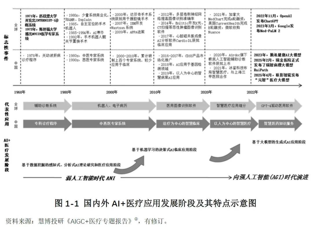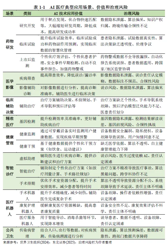 随着人工智能技术与医疗健康领域的深度融合,AI 医疗已成为全球医疗产业变革的核心驱动力,同时也带来了技术、数据、法律、伦理等多维度的复杂治理挑战。本报告基于上海社会科学院信息研究所联合港大 - 复旦 IMBA 项目明博学社医疗健康产业俱乐部等机构发布的《AI 医疗治理白皮书(2026 版)》展开系统解读,全面梳理 AI 医疗的发展演进脉络、全球核心治理模式、中国治理现状与成效,深度拆解 AI 医疗全生命周期风险图谱,并在此基础上阐释 AI 医疗治理的核心规则体系与落地路径,最终提出面向不同主体的政策建议与行动倡议。白皮书核心提出三大基础性论断:其一,AI 医疗领域治理重于技术,治理是决定技术落地成败的基石,而非技术的附属品,医疗领域的高风险属性决定了算法领先无法对冲法律风险与信任鸿沟;其二,治理主体多元化是行业发展的必然趋势,AI 医疗治理是复杂的社会技术系统工程,单一政府监管无法覆盖技术迭代全流程,需全链条主体协同发力;其三,治理机制动态化是风险防控的关键,AI 医疗技术的快速迭代与算法漂移特性,要求治理模式从静态准入转向动态演进,实现监管节奏与技术发展同频共振。本报告将围绕上述核心论断,对白皮书内容进行全维度、深层次的拆解与阐释。AI 医疗的爆发式发展,是技术突破、市场需求与政策支持三重因素共同作用的结果,2025 年 DeepSeek 大模型的普及标志着国内大模型平民化时代到来,2025 年也成为中国 “AI 医疗” 元年。从产业规模来看,AI 医疗展现出极强的增长潜力。国内市场方面,亿欧智库预测 2025 年中国医疗大模型市场规模接近 20 亿元人民币,2028 年将突破百亿元大关;全球市场层面,商业咨询机构 The Research Insights 数据显示,2030 年全球医疗 AI 市场价值将达到 1877 亿美元,期间复合年增长率高达 37%。技术层面,2006 年深度学习技术的复兴奠定了技术基础,2012 年 AlexNet 模型在图像分类领域的突破推动了医学影像分析的发展,2022 年底 ChatGPT 的发布则带动生成式 AI 在医疗领域的全面渗透,GPT-4 等大模型在医学考试和临床推理任务上已达到接近或超过人类及格线的能力,在多类疾病影像诊断中的准确率已与三甲医院高年资影像科医生相当。市场需求层面,AI 医疗实现了产业链全环节的价值释放。对药企而言,AI 可缩短药物研发周期、降低研发成本,助力靶点发现与化合物匹配;对医疗机构而言,AI 可替代大量常规性工作,优化诊疗流程、提升服务效率;对患者而言,人口老龄化、慢性病患病率上升与医疗专业人员短缺的矛盾,使得 AI 医疗成为提升医疗服务可及性、降低诊疗误差的重要支撑;对监管部门而言,AI 医疗可优化医疗资源配置、缓解医疗经费不足与资源分布不均的行业痛点,成为医疗体系数字化转型的核心抓手。人工智能在医疗领域的应用经历了从量变到质变的完整演进过程,整体可划分为三个核心阶段,逐步从弱人工智能向强人工智能时代迈进。第一阶段为基于规则的专家系统与早期机器学习阶段,时间跨度为 1960 年代至 2011 年。这一阶段的核心探索集中于医疗专家系统,1970 年代匹兹堡大学开发的 INTERNIST-1 系统、斯坦福大学研发的 MYCIN 细菌感染专家系统,成为 AI 医疗领域的开创性成果。这类系统通过将医学专家知识编码为 “如果 - 那么” 的规则模拟临床诊断推理,但存在知识库更新困难、泛化能力弱、无法处理不确定性等核心缺陷。后续支持向量机、随机森林等传统机器学习算法开始应用,可从结构化医疗数据中学习模式用于疾病风险预测,但整体应用范围狭窄,仍属于弱人工智能发展阶段。第二阶段为深度学习驱动的单一任务模型阶段,时间跨度为 2012 年至 2022 年 10 月。2012 年深度学习在图像识别领域的突破性进展,推动 AI 医疗进入首个黄金发展期,核心应用集中于医学影像诊断领域。基于深度学习的 AI 模型在肺结节检测、糖尿病视网膜病变筛查、皮肤癌识别等单一任务上,准确率已能媲美甚至超越人类专家,2017 年斯坦福大学团队在《自然》杂志发表的皮肤癌识别深度学习研究,成为该阶段的里程碑事件。这一阶段的 AI 模型呈现 “专而精” 的特点,一个模型仅解决特定临床问题,但存在模型相互独立、开发成本高、依赖大量精细标注数据的局限。第三阶段为认知智能的探索与大模型的涌现阶段,起始于 2022 年 11 月至今。ChatGPT 的发布宣告生成式 AI 时代到来,彻底改变了非结构化医疗文本的处理模式,GPT-4、Med-PaLM 2 等医疗大模型通过海量多源医学数据预训练,实现了前所未有的知识整合与推理能力。这一阶段的 AI 医疗形成了 “基础大模型 - 领域专用模型 - 临床微调模型” 的三级技术架构,应用场景从单一模态向多模态融合拓展,角色从单一诊断工具向虚拟医生助手、医学研究伙伴延伸,能够实现病历总结、报告生成、科研假设提出等复杂任务,成为 AI 医疗从弱人工智能向强人工智能演进的关键转折点。AI 医疗的应用已覆盖医疗健康全产业链,核心可划分为临床实践、生物医学研究、公共卫生、医疗管理四大领域,不同应用场景均伴随差异化的原生治理风险。在临床实践领域,AI 的应用涵盖诊断、治疗决策、临床研究全环节,核心包括医学影像辅助诊断、临床辅助决策、智能诊疗、手术机器人、康复护理机器人等场景。其核心价值在于提升诊断准确率与诊疗效率,优化手
