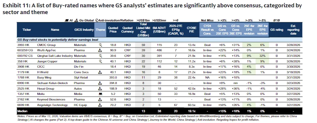 高盛认为A股盈利增长连续四个季度领先于离岸中资股(H股等),并将A股2025年盈利增长预测从8%上调至10%。业绩季中,必需零售(离岸)、非银金融、金属与采矿板块可能带来上行惊喜,而互联网/在线零售和食品饮料板块则面临不及预期的风险。