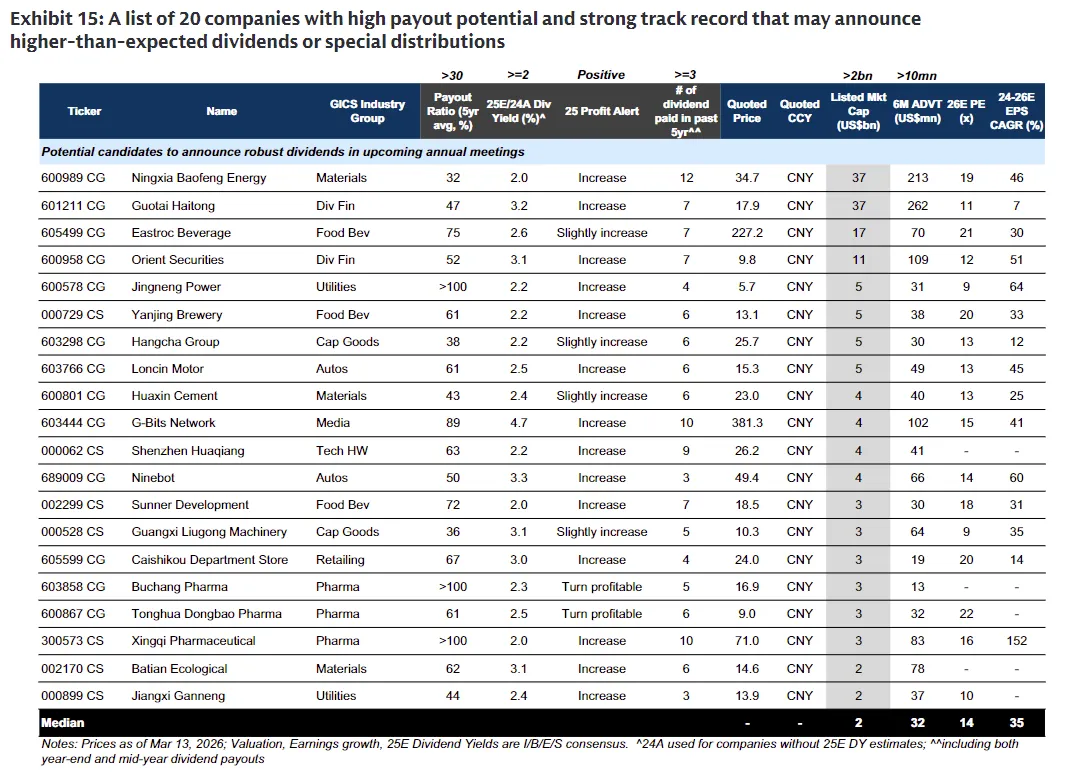 投资标的和行情规律上,高盛也给出了明确方向。盈利超预期的买入标的,基本锚定 AI、反内卷 / 再通胀、出海三大主线,这些标的也是推动指数 EPS 低速双位数增长的核心;同时还筛选出 20 家高分红潜力公司,筛选标准聚焦历史分红率、业绩预增、高股息率三大维度。从过去 5 年的数据看,盈利超预期的股票发布业绩后有明确的超额收益,港股的持续性能到 3 个月,A 股首周表现最强,后续虽有小幅回落,但整体仍跑赢基准。