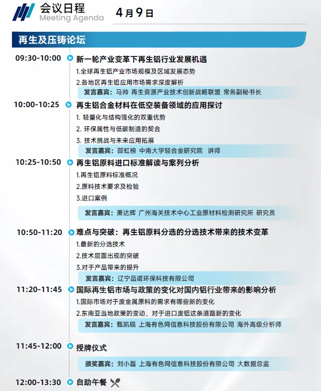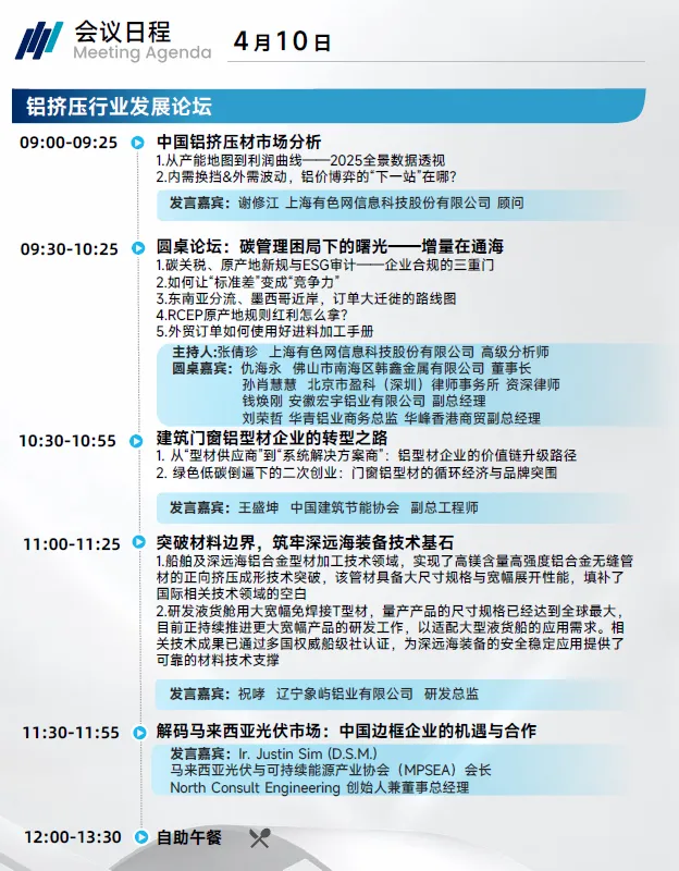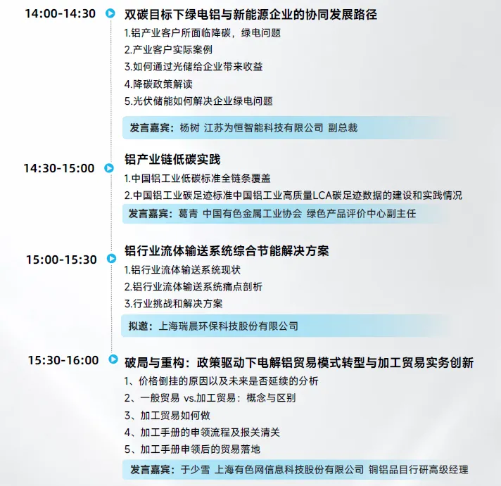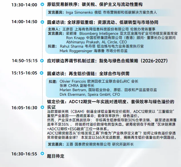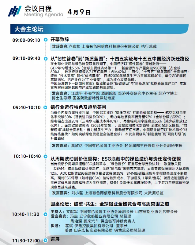 围绕“全球铝业价值重构与规则重塑”设置既涵盖宏观战略与行业趋势的顶层设计,又深入ESG实践、全球贸易、区域合作等具体场景,最终通过期货实践、圆桌论坛等形式形成“理论—实践—共识”的闭环。中国有色金属工业协会原副会长/名誉会长文献军、中国有色金属工业协会副秘书长莫欣达、上海有色网大数据总监刘小磊、辽宁象屿铝业有限公司总经理冯垚、蔚来汽车供应链可持续负责人陶治源等将发表主旨演讲。