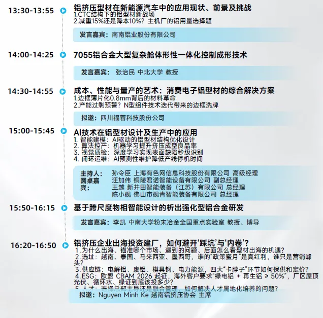 展会同期将举办铝上游、铝压延、铝挤压、铝熔铸、再生压铸、铝业新质生产力等九大高峰论坛,汇聚铝行业全球顶尖专家、企业家、投资人,共同探讨铝基材料在新能源、航空航天航海、汽车轻量化、军工、电子电器、包装、低空经济、人形机器人、船舶等领域的创新应用,为产业链上下游搭建前瞻探索、技术交流、供需对接与战略合作的国际化平台!