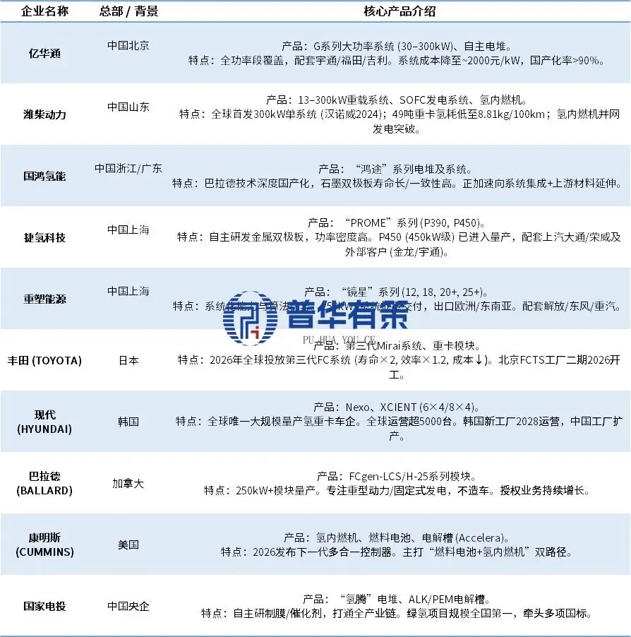 燃料电池行业重点企业/玩家