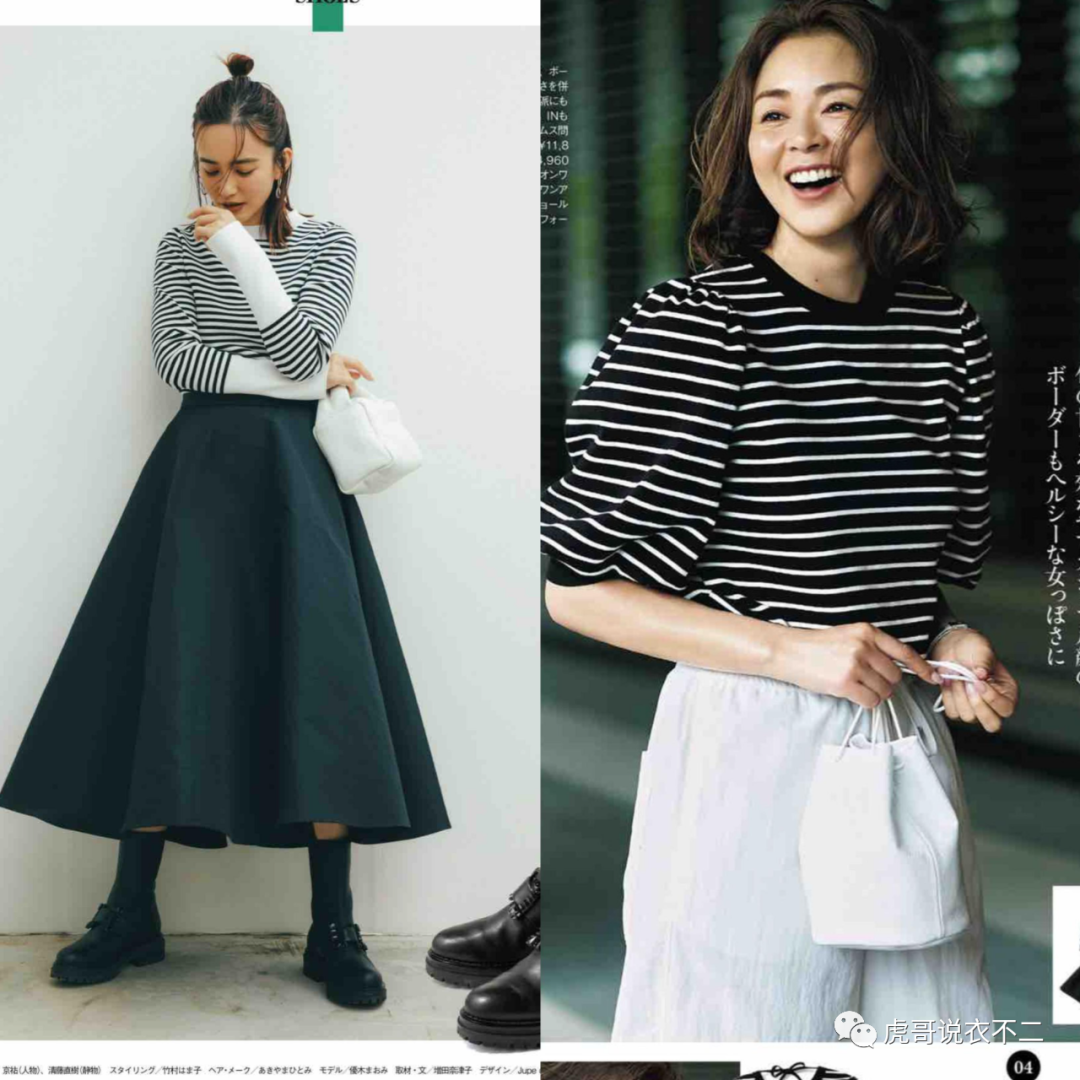 可以利用黑白样式的条纹上衣,增加造型的减龄效果,在下半身可以匹配宽大一点的黑色半身裙,配色也会有所呼应,造型特别基础。