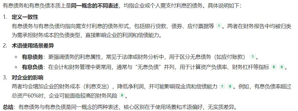 答:二者是一个意思,一样的计算方式,是同一概念的不同表述。用腾讯元宝提问“有息债务和有息负债是什么关系”,回答如下: