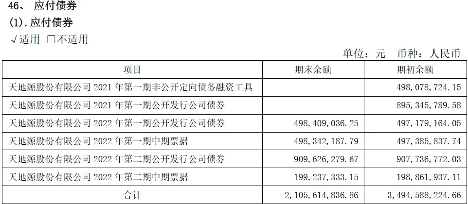 应付债券的附注部分,还会详细列出每一支债券的具体发行、余额变动信息,以天地源为例,披露的格式如下: