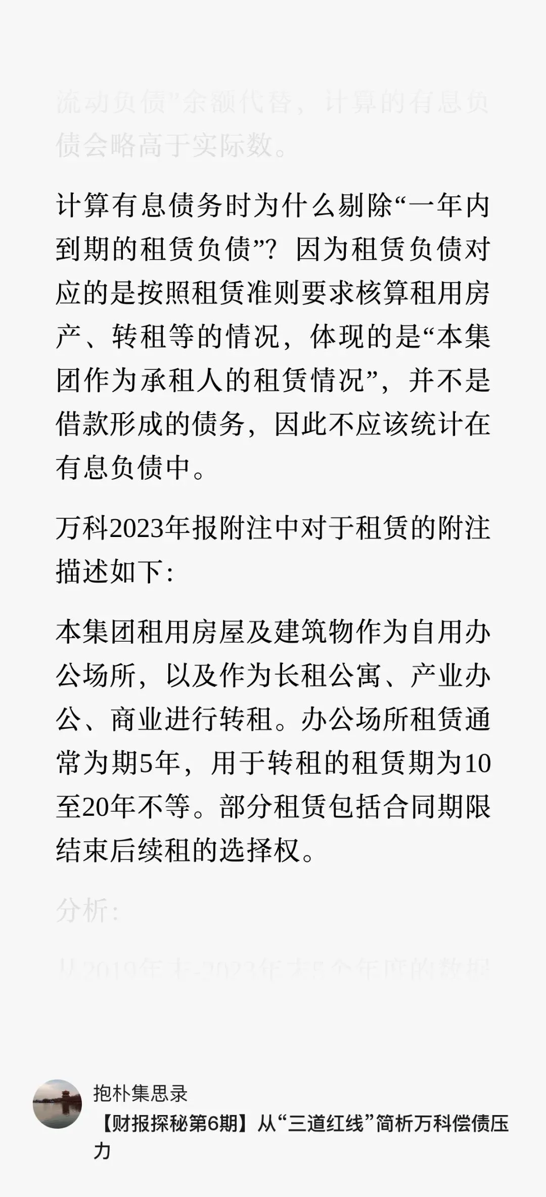 在上篇文章【财报探秘6】中,计算万科有息负债,就使用的是算法二的公式,剔除了一年内到期的租赁负债。