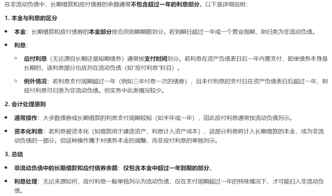 这个问题我刚提出来的时候,有点迷惑了,所以借助了AI工具元宝+DS,问题:非流动负债中的长期借款、应付债券余额,包括超过一年的利息部分吗?答案如下: