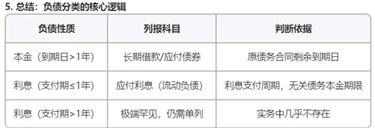 看到这个答案,不得不再次感叹AI工具的强大,分析地有理有据。回答中提到的例外情况——计提利息并调整借款本金,实务中很难遇到,因为涉及到合同条款的特殊约定,如利息递延支付并转为长期债务,所以如果不考虑特殊情况,那么结论就是:不考虑特殊情形时,非流动负债中的长期借款、应付债券余额仅包含本金,不包含任何利息部分(无论是超一年的利息还是其他利息)。AI总结的负债分类的核心逻辑如下: