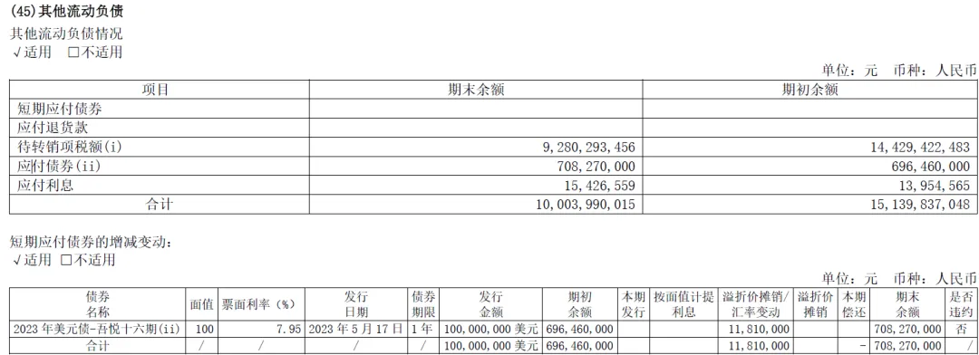 举例2:上市房企滨江集团2023年报附注其他流动负债中,包括了期限1年的美元债。