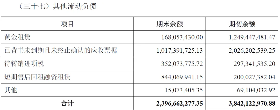 除了黄金租赁,短期售后回租融资租赁也是属于有息负债。关于融资租赁这一融资方式,大部分企业会体现在长期应付款中,一年内到期的部分则体现在一年内到期的非流动负债,像陕西有色集团这样放在其他流动负债中比较少见。也有可能是因为开展的融资租赁业务,初始期限没有超过1年。