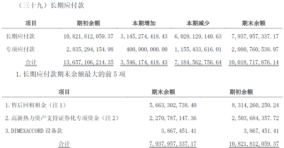 长期应付款中既有融资租赁形成的售后回租租金作为有息负债,发行的高新热力资产支持证券也是有息负债。