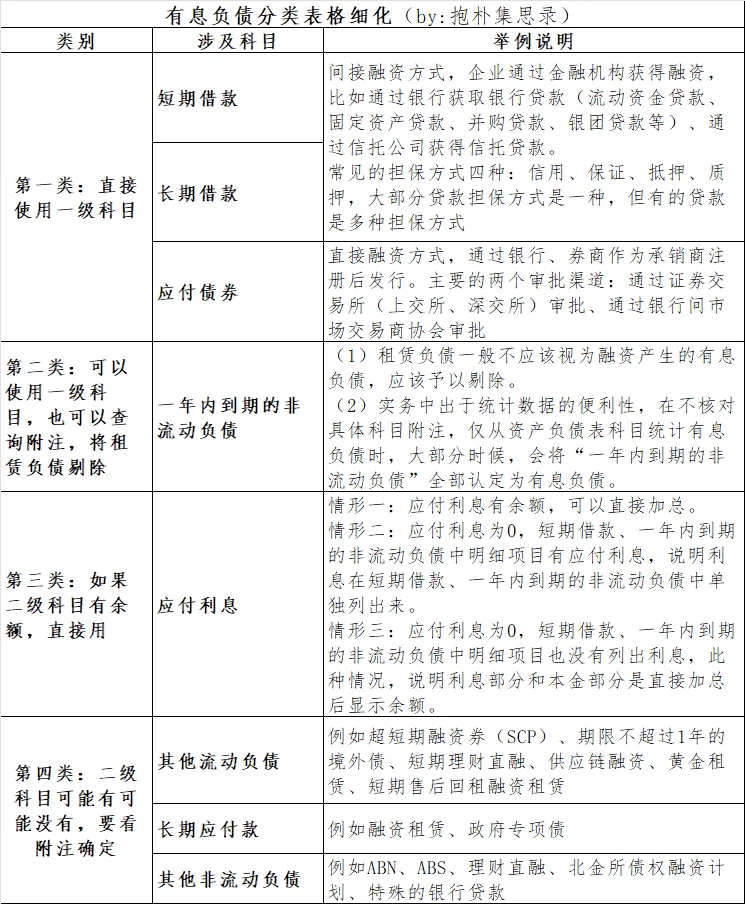 如果一级科目中,大部分都体现的是有息负债,那可以直接用这个科目,也可以从报表附注里进一步拆解,找出对应的有息负债金额,比如“一年内到期的非流动负债”就是这种情况,因为包含了“一年内到期的租赁负债”,而租赁负债一般不应该视为融资产生的有息负债,应该予以剔除。