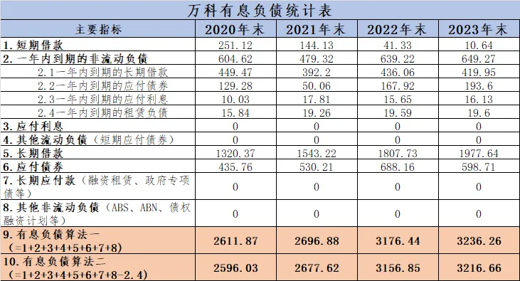 万科其他应付款中无应付利息余额,其他流动负债为待转销项税,无长期应付款,其他非流动负债中不涉及有息负债,因此统计有息负债比较简单,四个科目短期借款、一年内到期的非流动负债、长期借款、应付债券加总即可,计算结果是“9.有息负债算法一”。