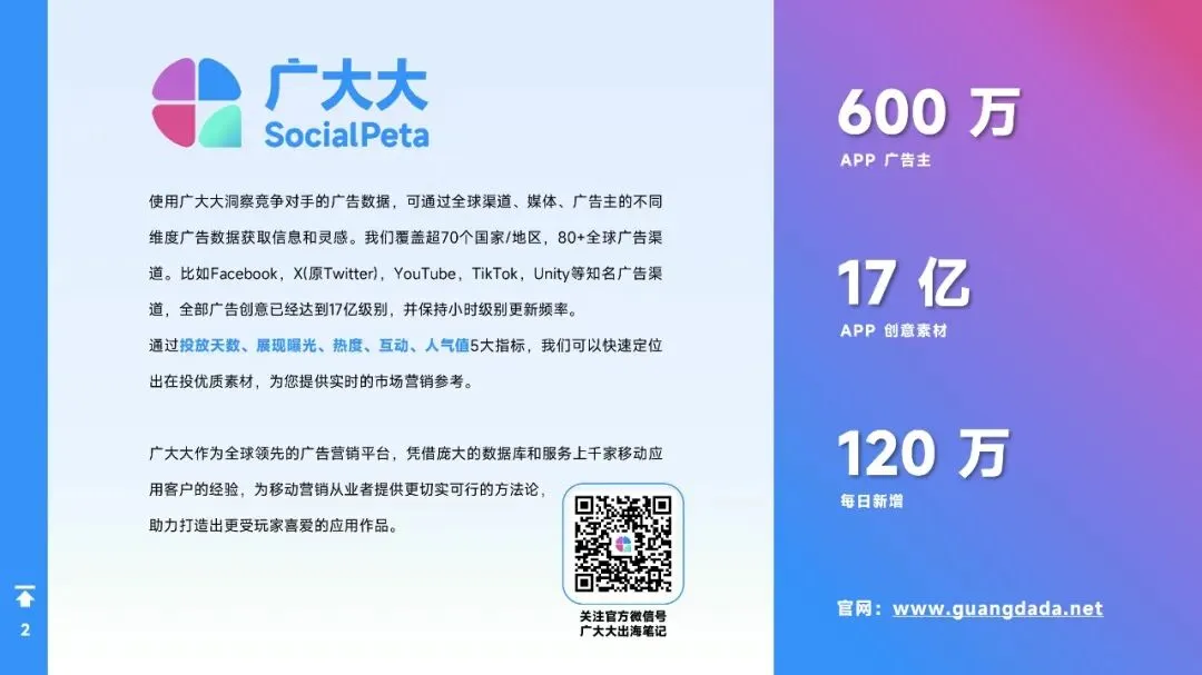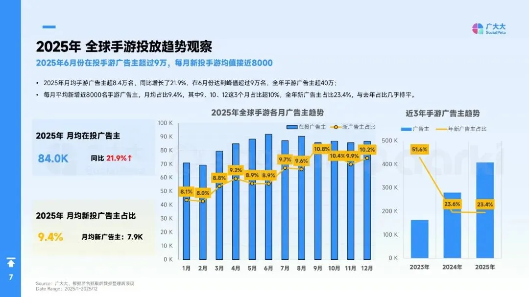 - 2025年全球手游广告主数量增长显著,月均超8.4万,全年超过40万,同比增长21.9%。