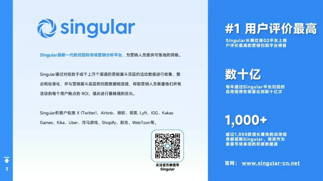 - Singular长期位居G2平台用户评价榜首,归因能力覆盖数十亿次安装。