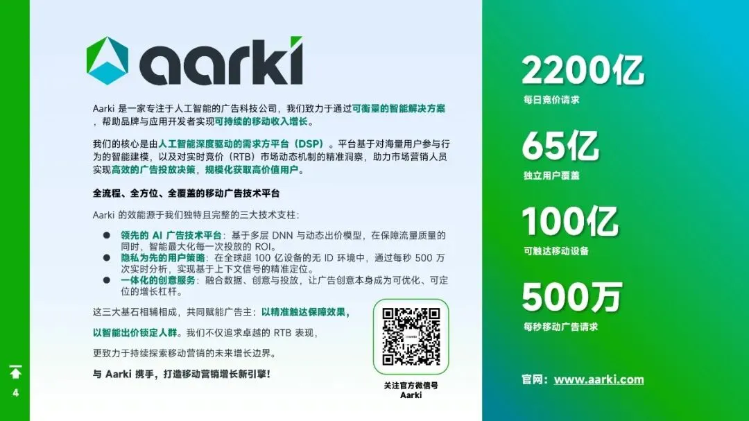 - Aarki凭借AI技术与全链路优化能力,成为推动增长的重要平台,其模型转化与混合绩效指标有效应对隐私带来的信号缺失。