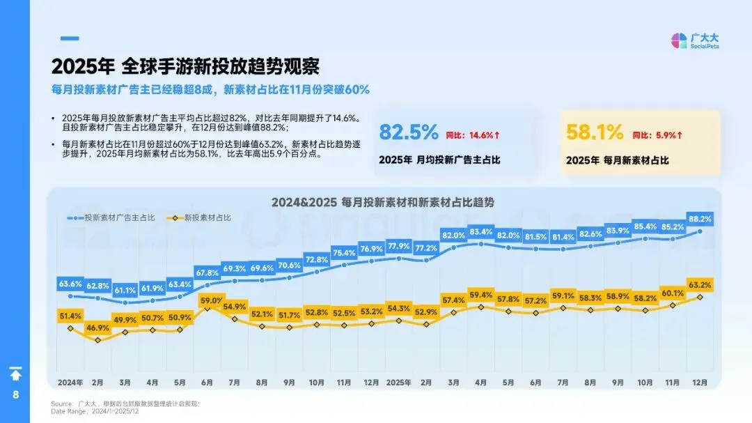 - 新素材投放占比持续提升,2025年月均达58.1%,11月突破60%,12月达63.2%。