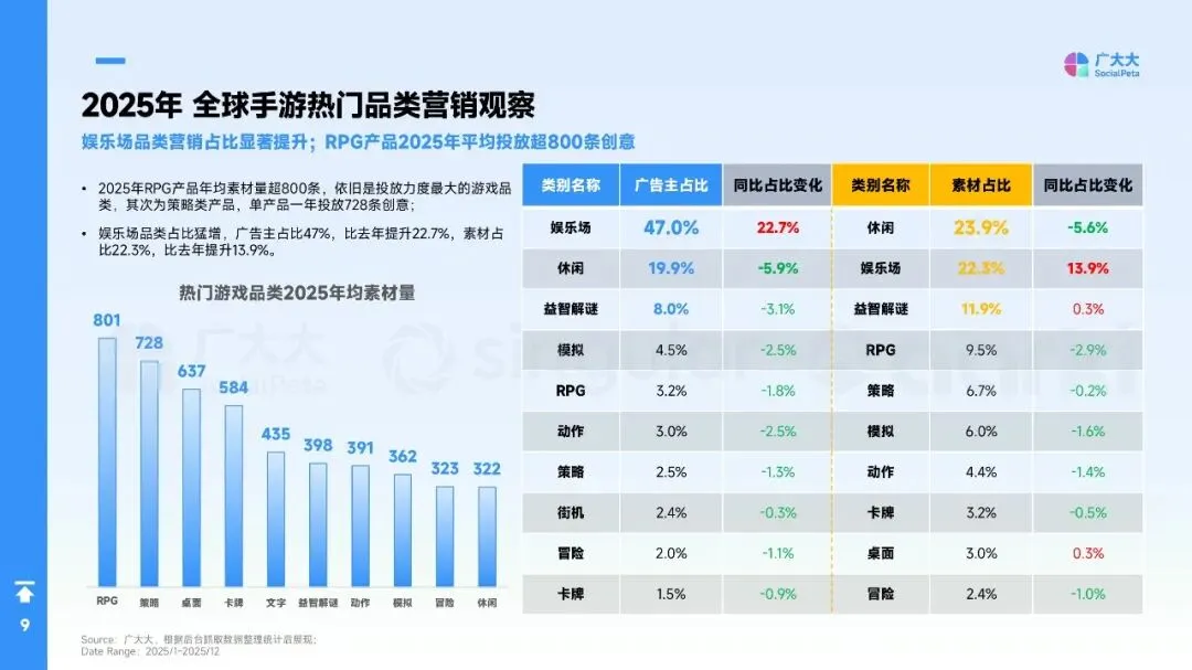 - 娱乐场品类广告主占比猛增至47%,素材占比达22.3%,是增长最快的品类之一。