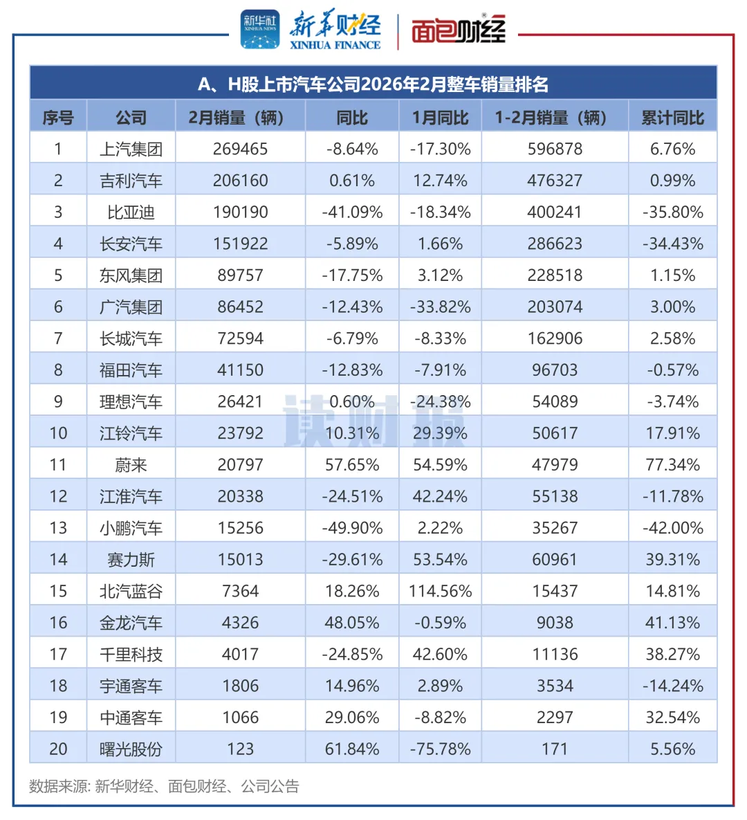 图2:A、H股上市汽车公司2026年2月整车销量排名