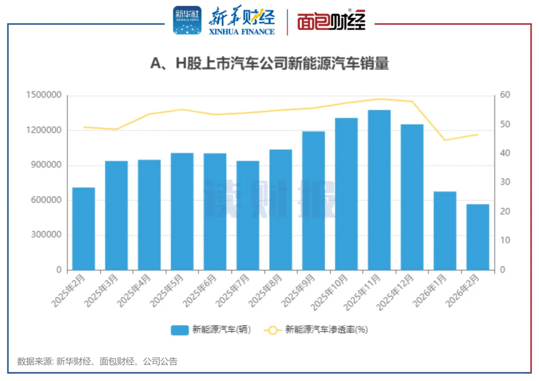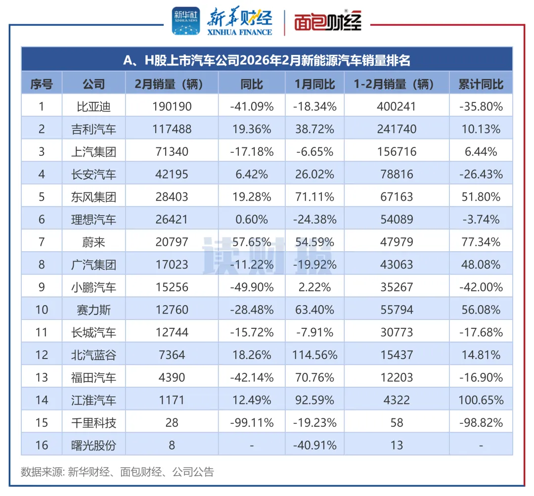 近期,汽车制造厂商陆续披露2月销售数据。新华财经和面包财经研究员以A、H股上市的主要汽车厂商披露的月度销售数据公告,分别统计其整车、新能源汽车的销量。