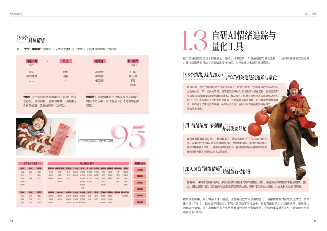 其实核心框架很清晰,以生存适应性、社会适应性、超越性这三层情绪来源为基础,结合心理学“效价-唤醒度”模型,划分出35个情绪大类和95个具体情绪,效价分积极、消极、中性,唤醒度则有高、中、低之分。量化分析靠的是小红书自研AI情绪追踪与量化工具,先清洗分析20万条春节相关笔记,把每条内容都匹配到对应的95类情绪标签,再通过情绪浓度指标,让原本抽象的情绪变得可追踪、可比较、可量化,这也是当下AI辅助营销洞察的典型应用。
