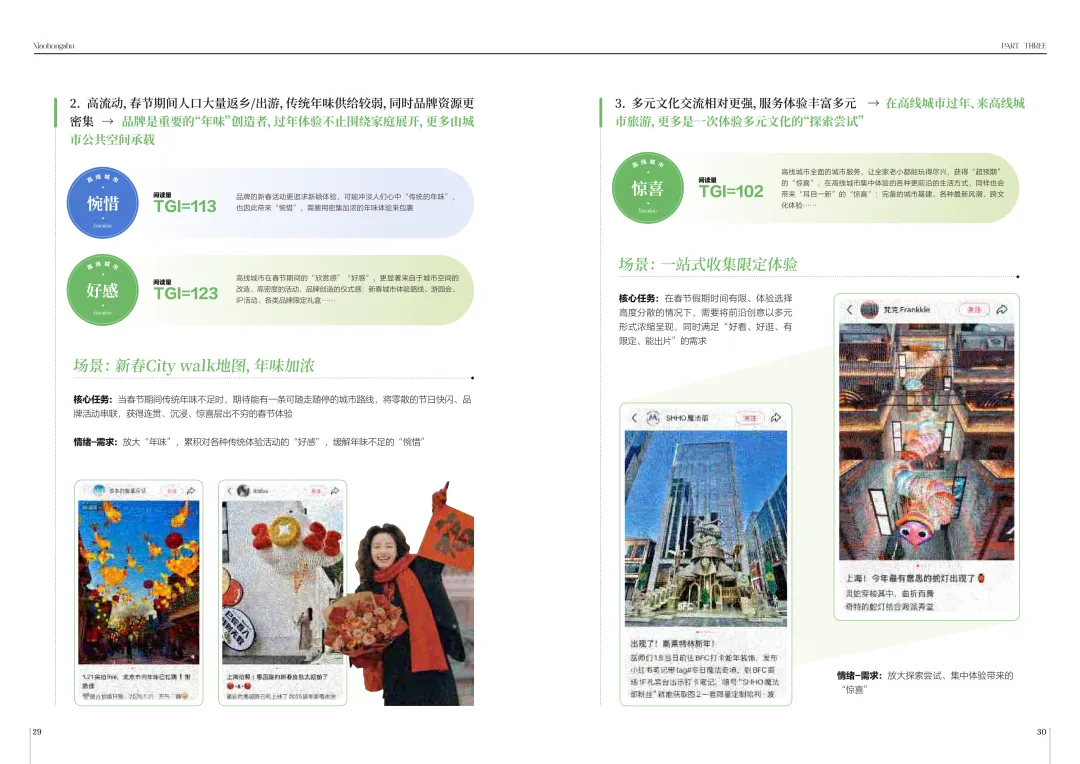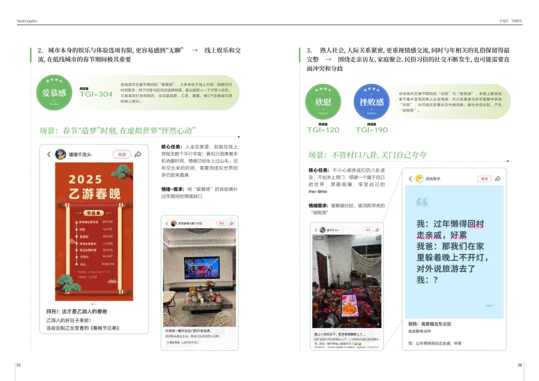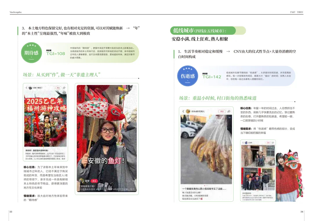 差别确实很明显,高线城市的核心情绪是解脱感、好感、惊喜和惋惜,对当地人来说春节更像“自由大假”,传统年味稍显不足,品牌可以打造新春Citywalk、限定IP活动这类沉浸式体验,弥补年味缺失的惋惜,契合城市年轻人的体验需求。中线城市作为人口回流汇集点,核心情绪是畅爽、期待感、挫败感和遗憾,本土年味浓郁,品牌可以聚焦本地逛吃、非遗手工这类低门槛体验,化解代际沟通带来的负面情绪,贴合本土年味消费趋势。低线城市生活节奏慢,线下体验有限,核心情绪是欣慰、伤逝感、爱慕感和纠结感,熟人社会特征明显,品牌可以从怀旧场景入手唤醒情感,挖掘线上娱乐的情绪出口,缓解密集社交带来的纠结,适配当地的生活节奏和社交特点。