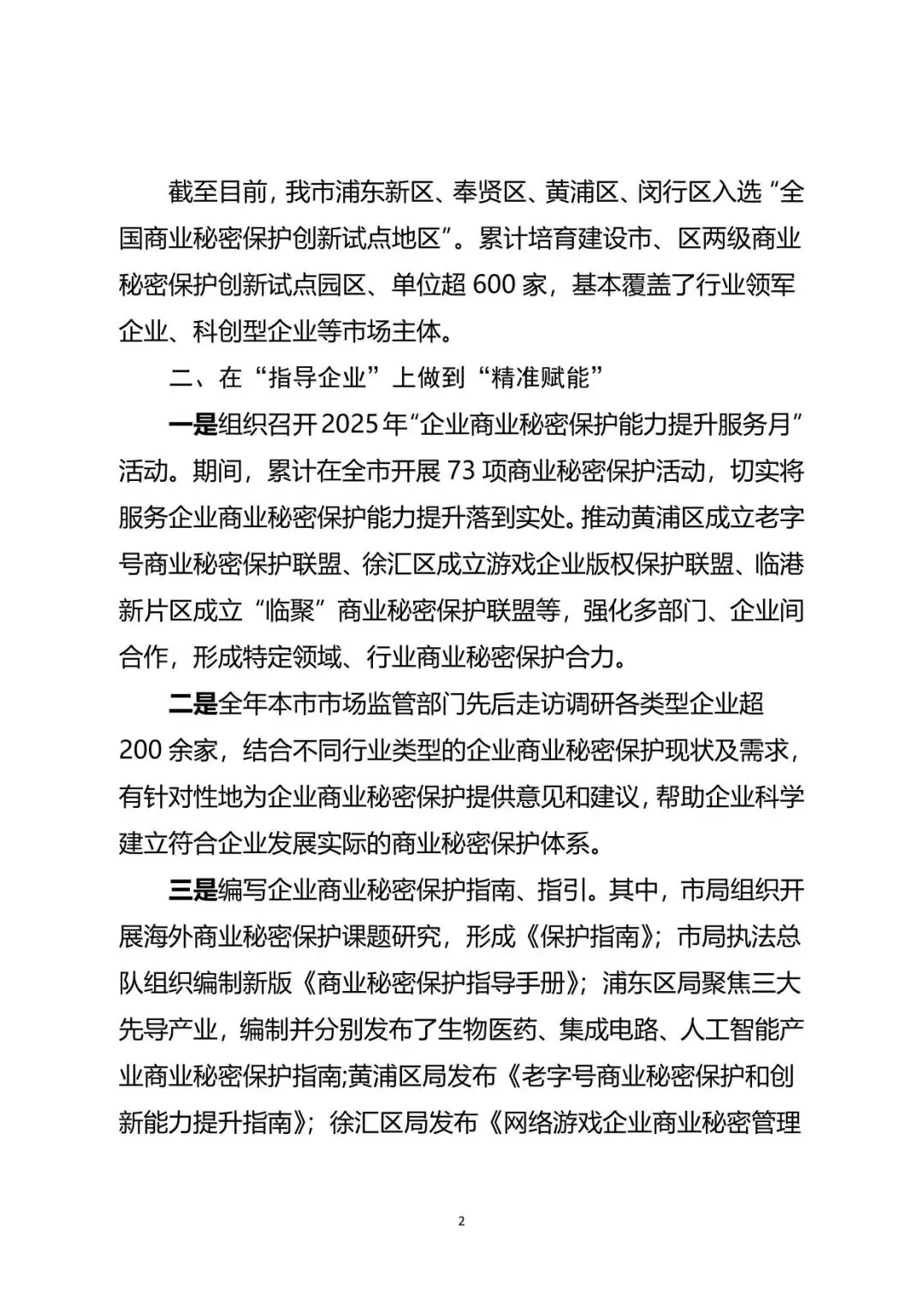《上海市商业秘密保护年度白皮书(2025年)》由上海市市场监督管理局发布,系统总结了2025年度上海市在商业秘密保护领域的整体推进情况、创新实践与工作成效。报告显示,上海以全面构建商业秘密保护新体系为目标,通过制度创新、精准服务、严格执法与国际对标,推动商业秘密保护水平迈上新台阶,为优化营商环境、激发企业创新活力提供了坚实保障。