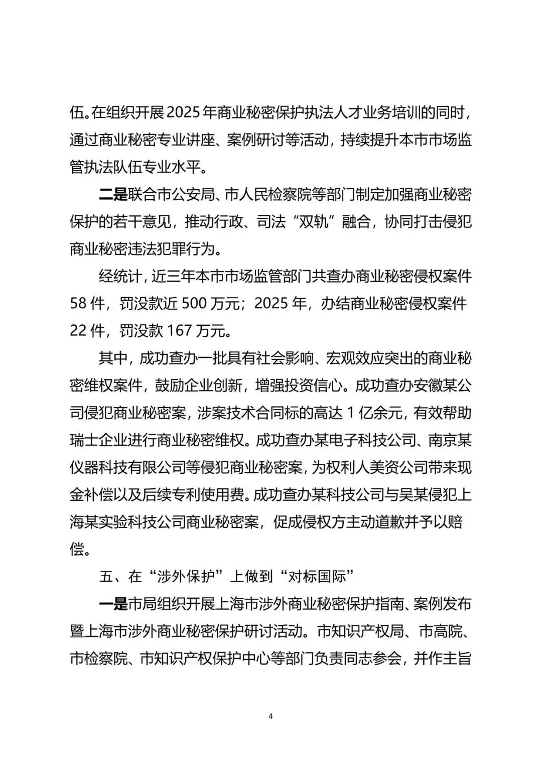 执法维权是保护商业秘密的关键防线。上海建立了专业的市级商业秘密执法人才队伍,并推动行政与司法保护双轨融合。近三年,全市市场监管部门共查办商业秘密侵权案件58件,罚没款近500万元;仅2025年就办结22件,罚没款167万元。成功查处了一批具有社会影响力的典型案件,例如帮助瑞士企业维权的安徽某公司案、为美资权利人争取到补偿的某电子科技公司案等,有效维护了权利人合法权益,增强了企业的创新信心和投资安全感。