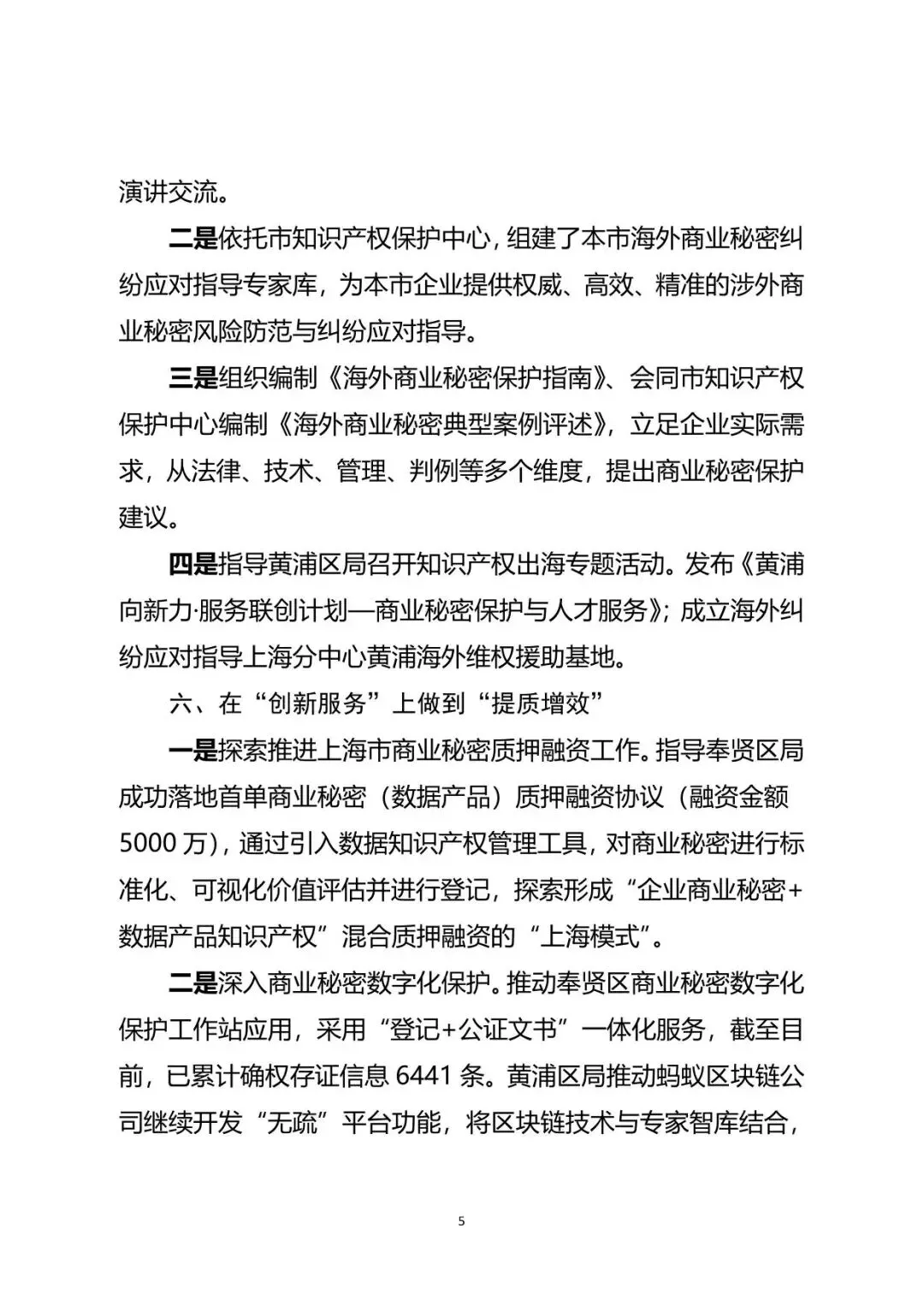 上海积极对标国际高标准,提升商业秘密保护的国际化水平。组织开展涉外商业秘密保护研讨活动,发布相关指南和案例。依托市知识产权保护中心,组建了海外纠纷应对指导专家库。在服务创新方面,探索出商业秘密质押融资的上海模式,指导奉贤区成功落地首单金额达5000万元的商业秘密数据产品质押融资。同时,深入推动商业秘密数字化保护,例如奉贤区的数字化保护工作站、黄浦区利用区块链技术的无疏平台等,利用科技手段为商业秘密保护提质增效。
