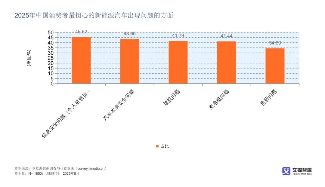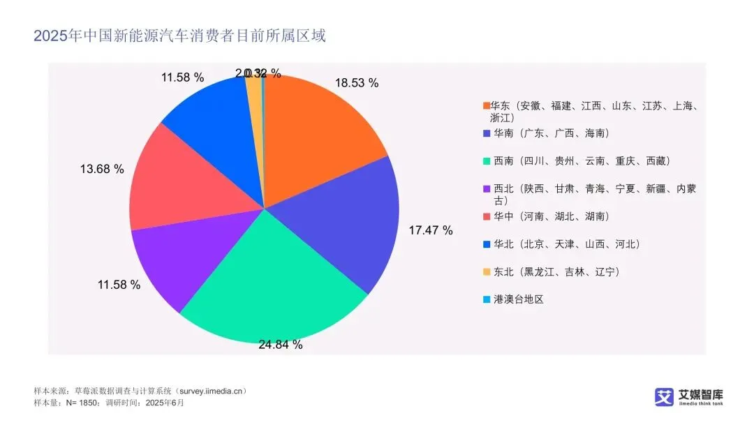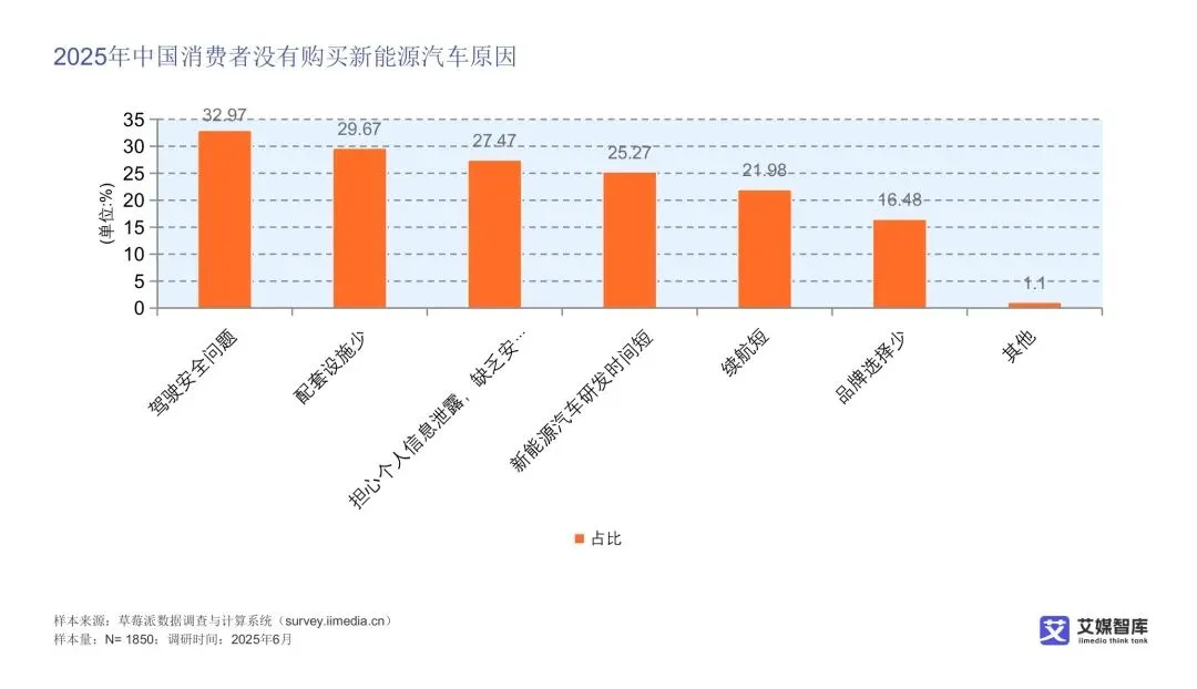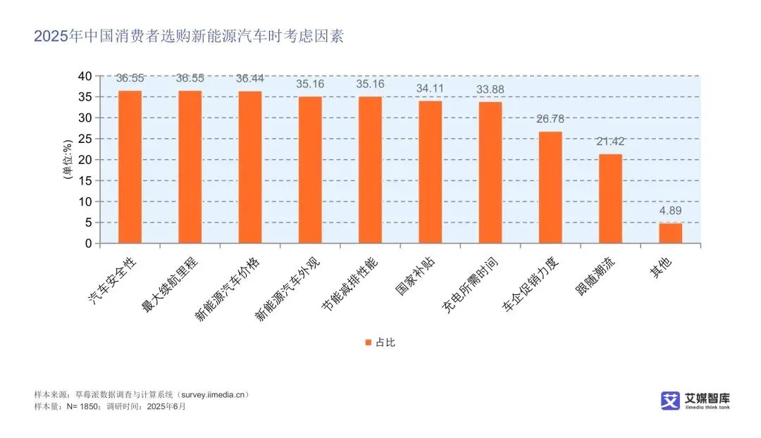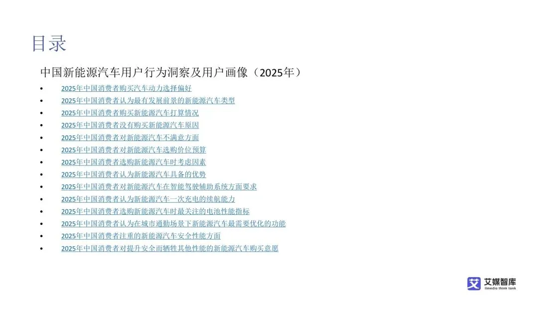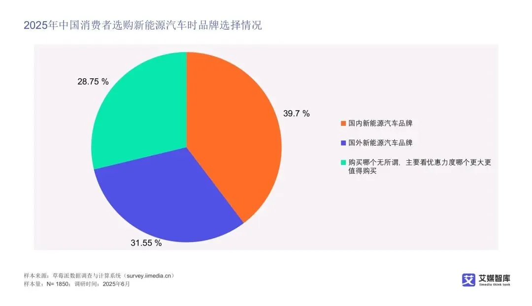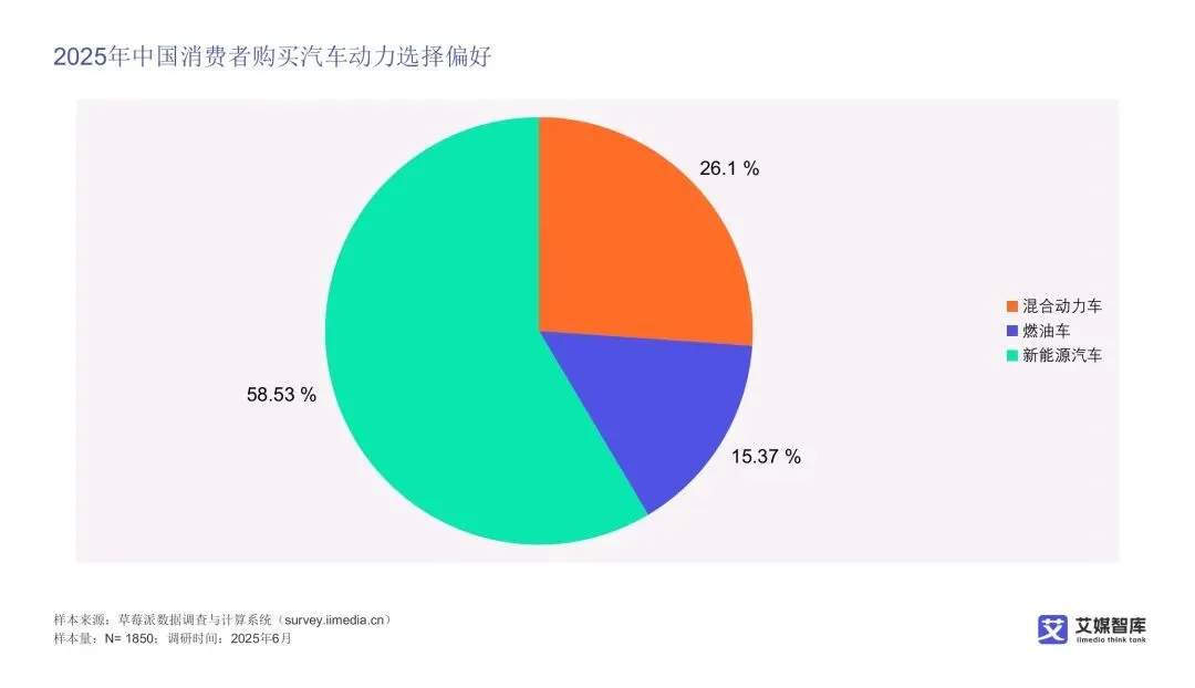 2025年国内消费者购车首选新能源的占比达58.53%,纯电与混动车型发展前景认可度持平,近半数未购车用户有明确得购买计划,新能源市场仍有充足增长空间。