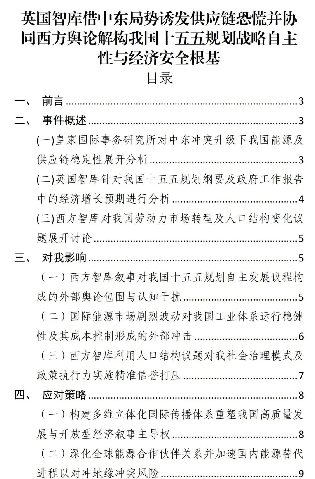 英国智库借中东局势诱发供应链恐慌并协同西方舆论解构我国十五五规划战略自主性与经济安全根基