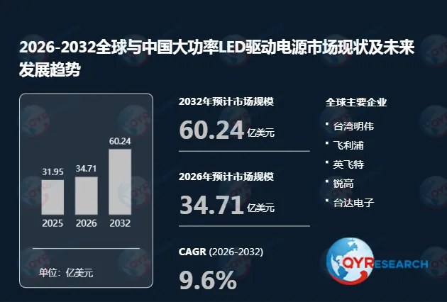 根据QYR(恒州博智)的统计及预测,2025年全球大功率LED驱动电源市场销售额达到了31.95亿美元,预计2032年将达到60.24亿美元,年复合增长率(CAGR)为9.6%(2026-2032)。