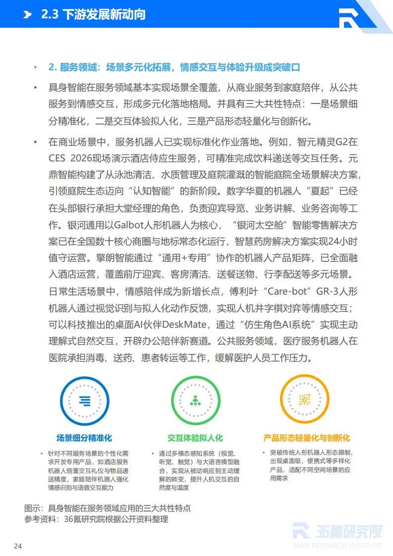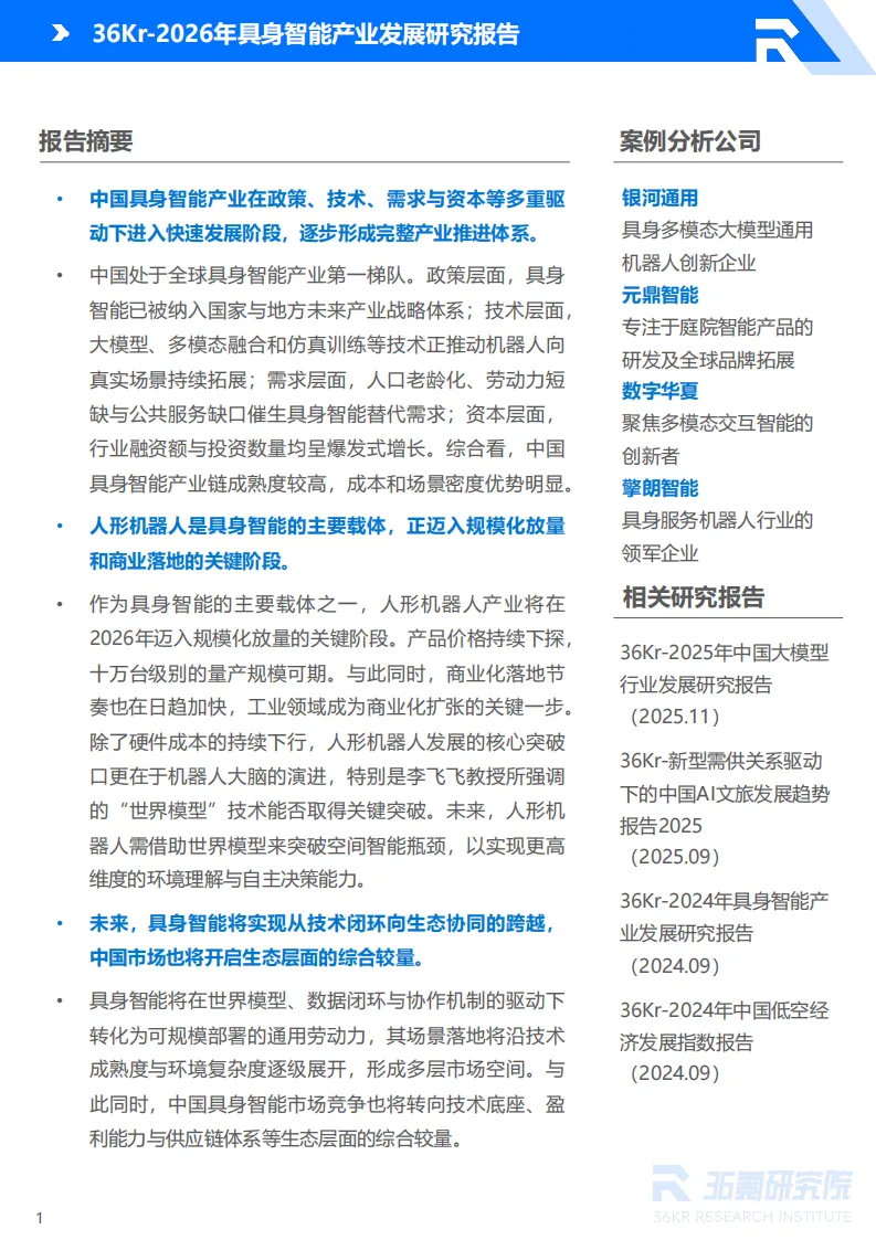 正如36氪研究院报告所强调的,中国具身智能产业已具备全球竞争力,随着技术持续突破、成本稳步下行与生态不断完善,2026年将成为其规模化落地的关键节点。未来,具身智能不仅将重塑制造业、服务业的生产模式,更将深刻改变人类的生活方式,而这场产业革命的核心,从来不是“机器替代人”,而是“机器赋能人”,让智能真正服务于人类的生产与生活。