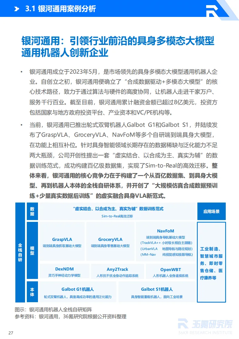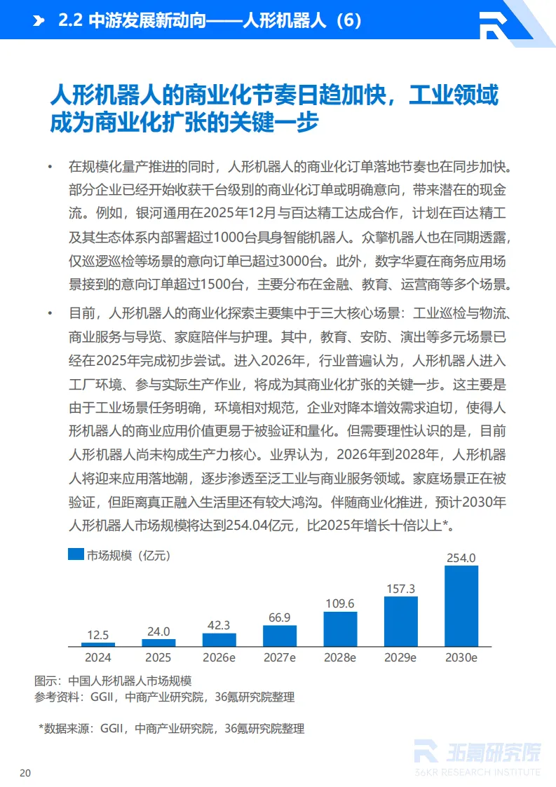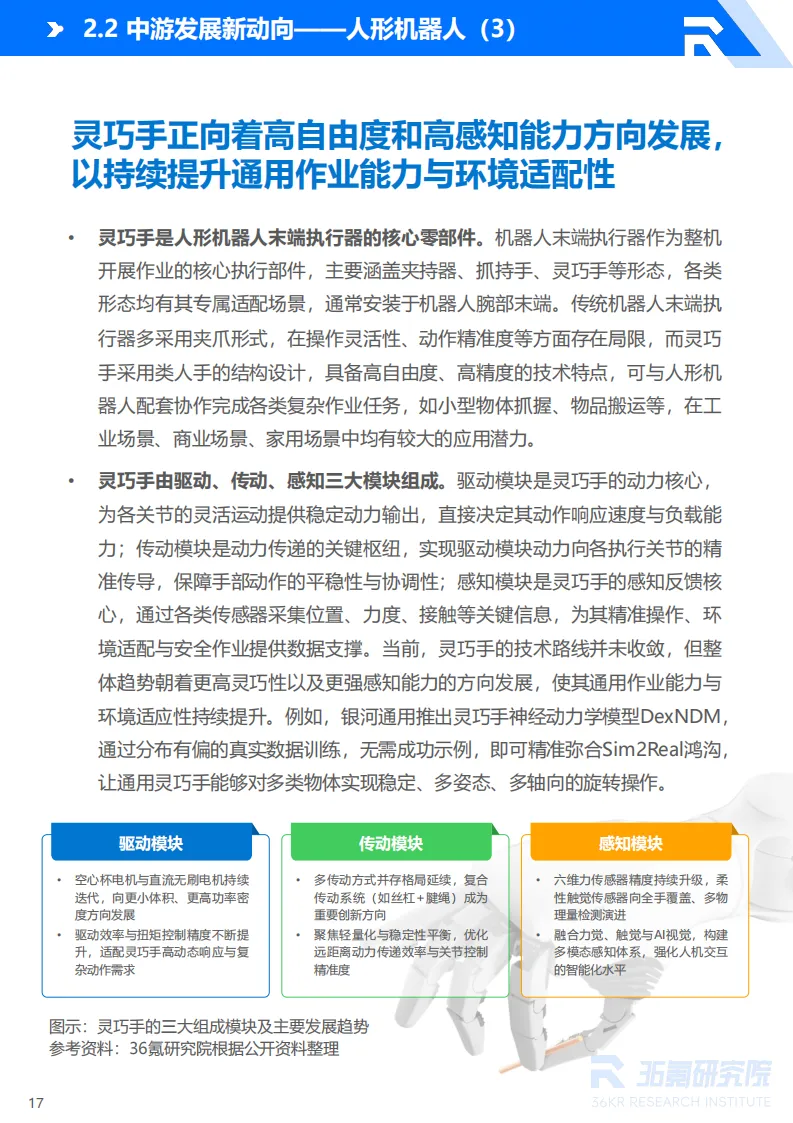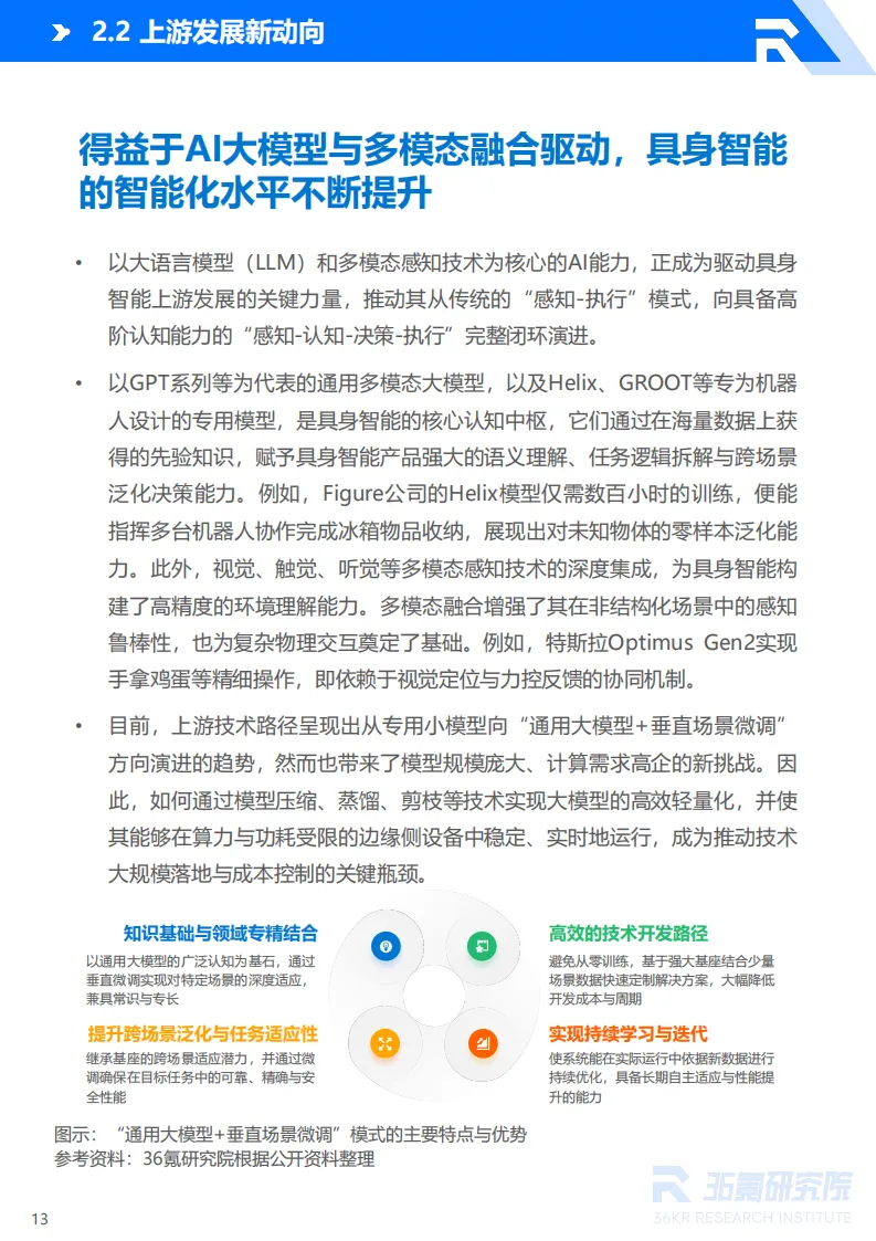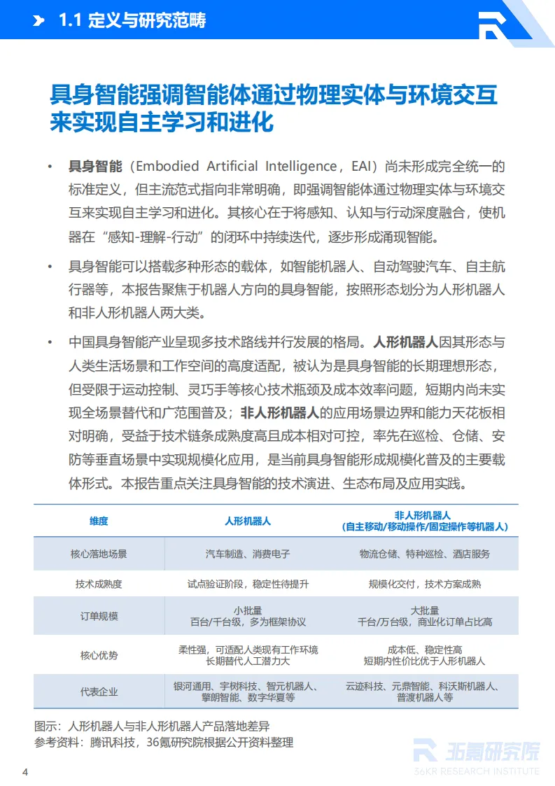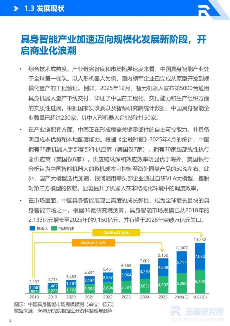 36氪研究院发布的《2026年具身智能产业发展研究报告》(以下简称《报告》)明确指出,中国具身智能产业已进入高速发展新阶段,稳居全球领先阵营,人形机器人正迎来规模化量产的关键窗口期,产业竞争的重心已从单一技术的单点对决,升级为生态体系的全方位较量。