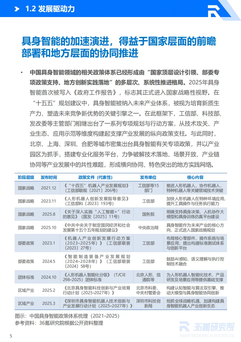 在政策层面,具身智能已上升至国家战略高度,形成了“国家顶层设计引领、部委专项扶持、地方落地推进”的多层次政策支撑体系。2025年,具身智能首次被写入《政府工作报告》,正式纳入“十五五”未来产业发展布局,工信部、科技部等相关部委密集出台扶持政策,重点聚焦核心技术攻关与场景化应用推广;北京、深圳、合肥等产业重点城市同步出台专项行动方案,以产业园区为核心载体,着力破解技术落地梗阻与产业链协同难题,为产业高质量发展筑牢政策保障。