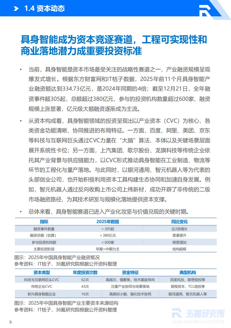 资本领域,具身智能已成为资本市场的核心投资热点,融资规模呈现爆发式增长态势。2025年全年,具身智能产业融资总额超380亿元,融资事件数量突破305起,参与投资的机构超过600家。百度、阿里等科技巨头凭借产业资本布局核心技术底座,上汽、歌尔等传统企业聚焦场景落地展开布局,头部创业企业则借助资本力量加速技术研发与规模化交付,持续的资本注入为产业发展提供了充足的资金保障。