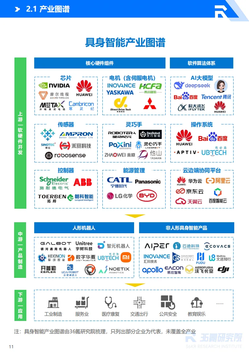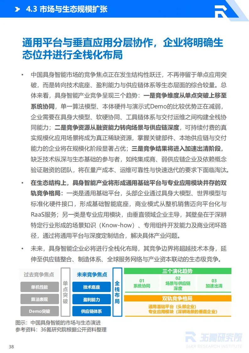随着具身智能逐步走向规模化发展,产业竞争已不再局限于单一技术或产品的比拼,而是转向技术底座、供应链体系、场景落地能力等生态层面的全方位博弈,《报告》通过产业图谱梳理与典型案例分析,清晰呈现了当前的产业生态竞争格局。