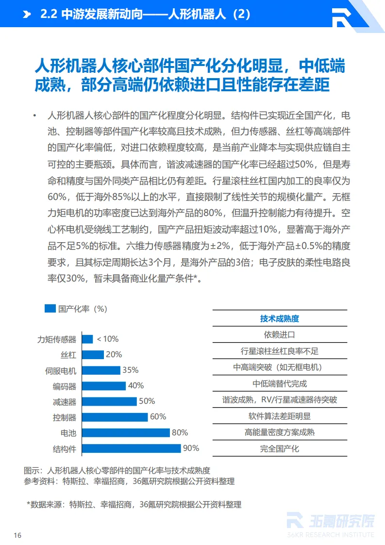 从硬件成本来看,人形机器人的成本主要集中在执行器与传感器两大核心零部件,二者合计占比超过60%。近年来,随着核心零部件国产化进程的不断推进,成本下行趋势日益明显——优必选Walker系列机器人2025年成本较2024年下降25%,宇树科技推出的小型人形机器人起售价仅2.99万元,松延动力的小尺寸机型预售价格不足万元,成本的持续下降正不断降低规模化量产的门槛。但值得注意的是,行星滚柱丝杠、六维力传感器等高端零部件的国产化率依然偏低,其良率与性能与海外同类产品相比仍有差距,仍是制约成本控制与供应链自主可控的核心难题。
